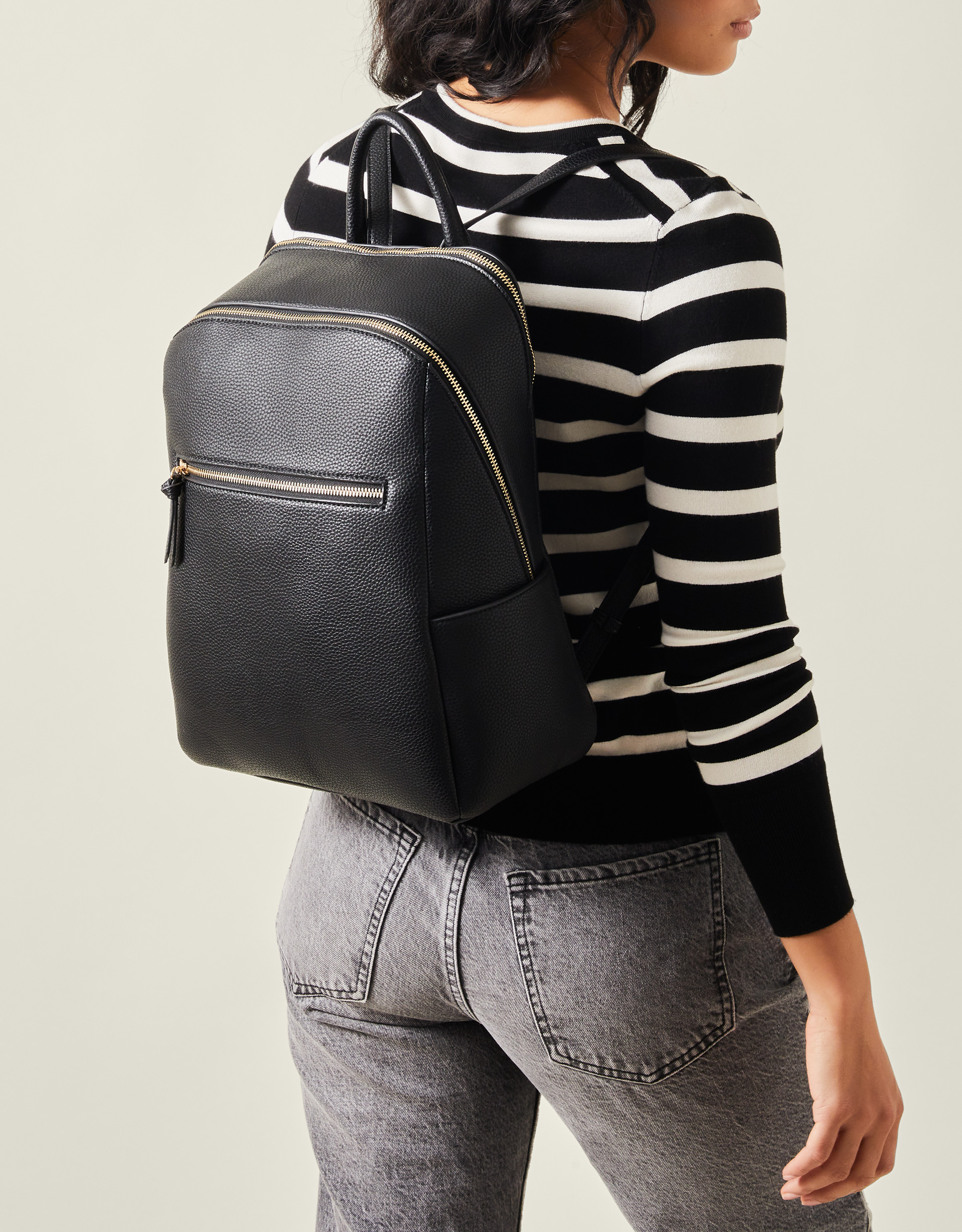 As suitable for early morning commutes as it is for holiday ventures, this bag does it all. Transitioning through the seasons with ease, its spacious interior includes several pockets and compartments to hold your laptop, purse and lanyard. Designed in faux-leather, wear it as a rucksack with the adjustable straps or in-hand for easy access. Fits a 12x8 in laptop. Black
