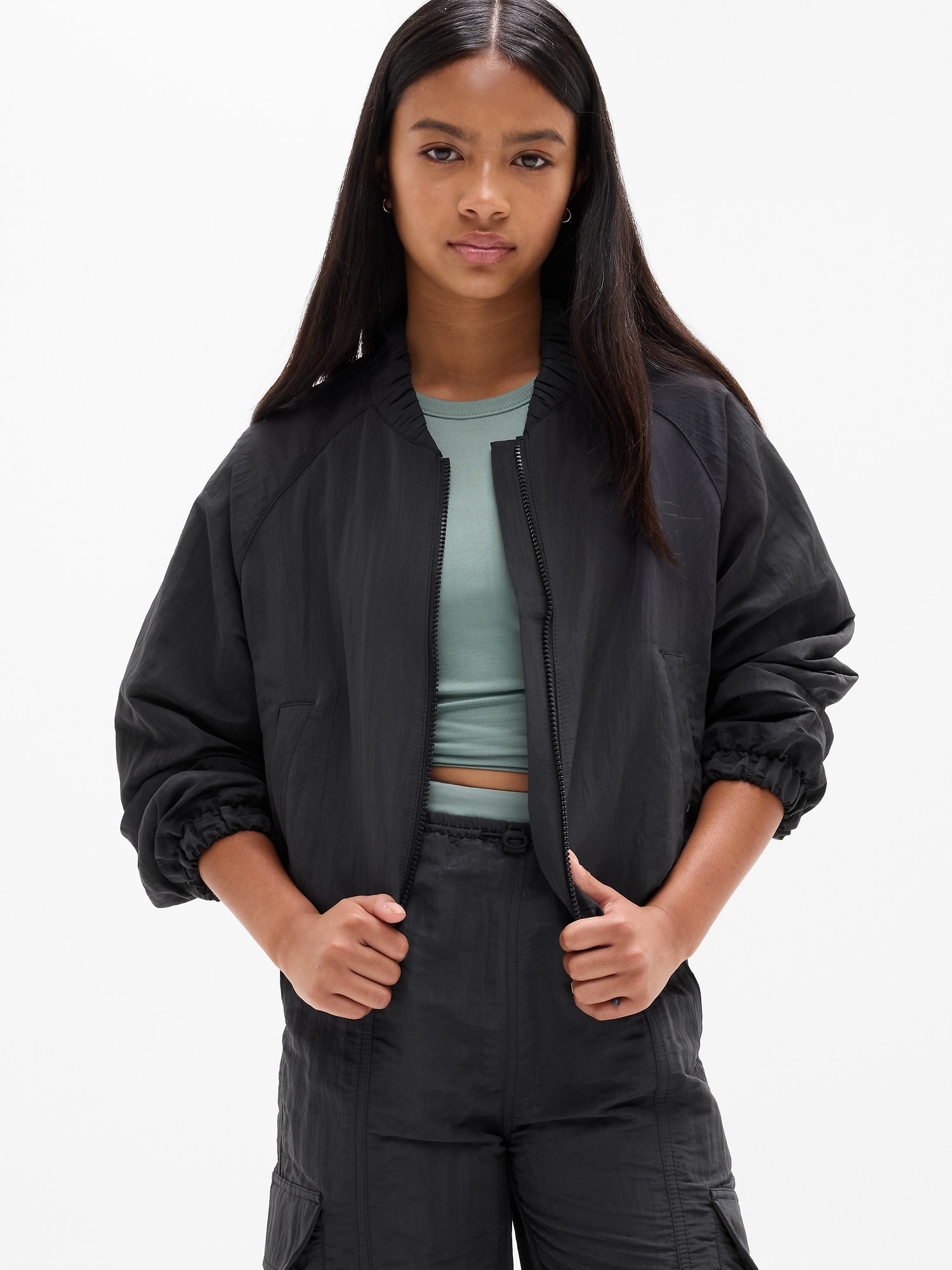FOR: Serving on the court and teeing up on the course FEEL: Super-fine recycled ripstop is crisp, air-light, and cool to the touch FAVE: Two lightweight layers in one—a bomber jacket and racerback vest, always ready to pair or wear apart Relaxed with room to move freely or layer up High hip length, hem hits at upper hips.