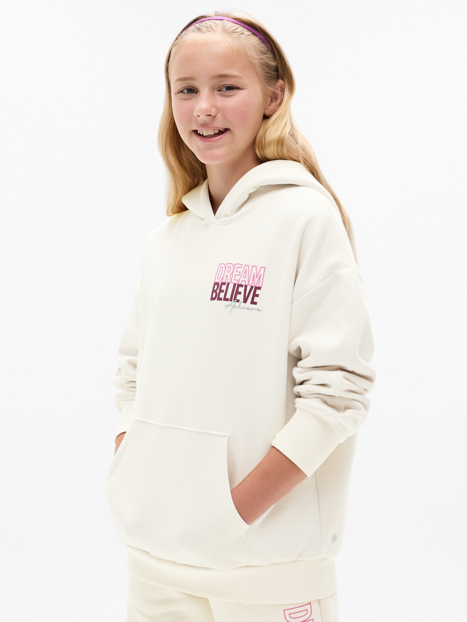 FOR: Post-practice hangouts, homework—wherever FEEL: Lightweight brushed fleece is the softest fabric imaginable FAVE: Thumbholes keep her sleeves in place Front pocket for easy storage and keeping her hands free Oversized fit.