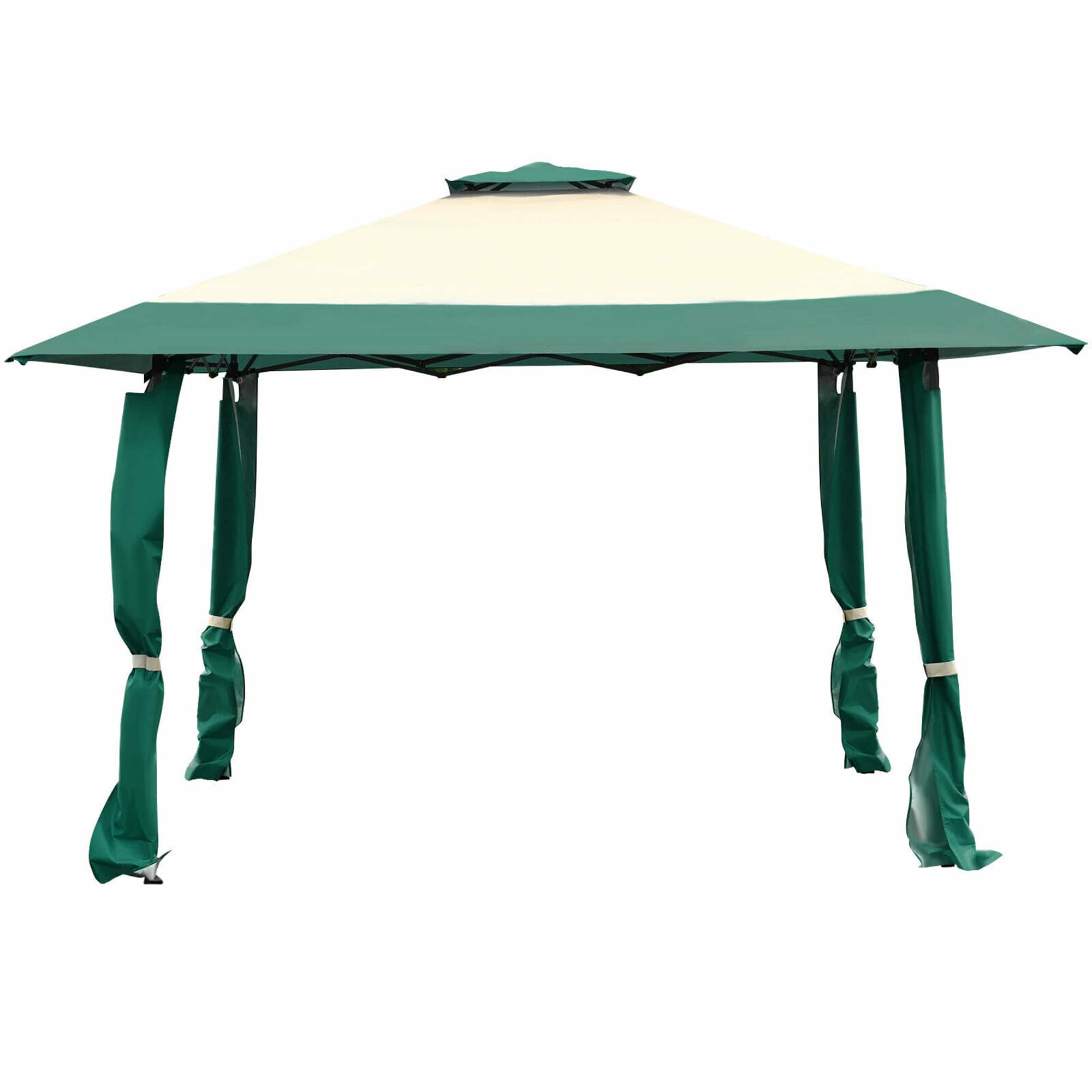 Enjoy the summer day and night with our 13' x 13' pop-up canopy tent which you can't miss. The garden gazebo is constructed with power coated steel and high quality oxford fabric cover, which will perfectly protect you from rain and sunlight, and can be used for a long time. Double tier roof design expends the height of the canopy and provides proper ventilation and air flow. Moreover, the height of canopy can be adjusted in three positions to meet your different needs. Equipped with a wheeled carrying bag, it is easy for you to take the canopy to the beach, tailgate, park and other places. Don't hesitate to take it home!