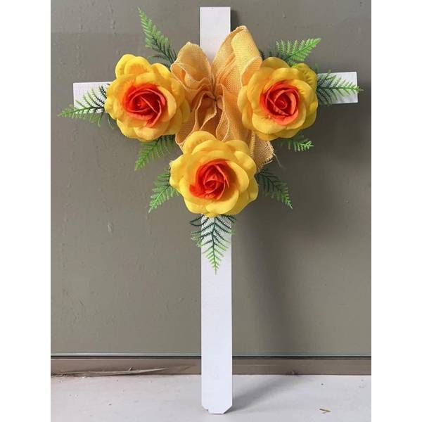 Handcrafted Wooden Memorial Cross with Floral Deco...