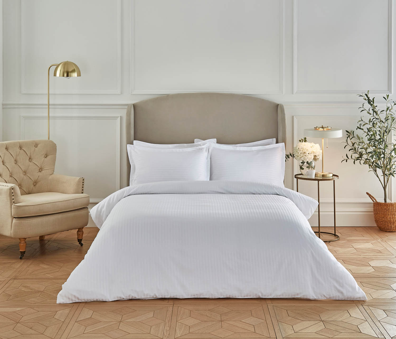 Quiet Luxury - Established in 1866, Liddell luxury linens can be found in the world's most exclusive hotels, restaurants and spas. Founded on the banks of the River Lagan in Donaghcloney, Ireland; Liddell has been crafting and creating beautiful linen for over 150 years. For decades, the brand has built a reputation on luxury, understated elegance and tradition, offering the ultimate in quality and finishing and bringing unrivalled experience to the market. From the maiden voyage of the Titanic, to the modern-day fineries of Dubai's Burj Al Arab, Liddell's linen has graced some of the world's finest establishments and continues to make a lasting impression. Our reputation speaks volumes. Our luxurious 400 thread count Egyptian cotton certified satin striped duvet cover set, offers ultimate hotel quality in the comfort of your home. Single size includes 1 x pillowcase, Double, King & Super King sizes include 2 x pillowcases.
