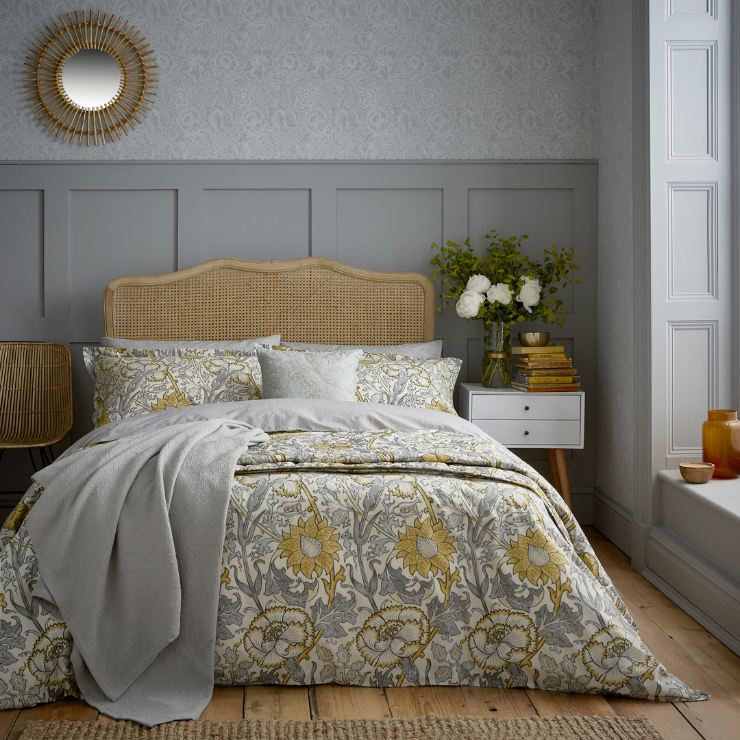 Designed by William Morris in 1890, Pink & Rose was a large scale block-printed wallpaper. This stylised design has now been translated into a bedlinen range and is available in an impressive grey colourway. The main design is complemented by a tonal floral outline pattern which is used on the reverse of the duvet cover (single, double, king and super king), and oxford pillowcase(s), which are sold in sets, Includes: 1 x Duvet Cover, 2 x Pillowcases Dimensions: W230 x L220cm Composition: 100% Cotton Percal Care Instructions: Machine Washable at 30c