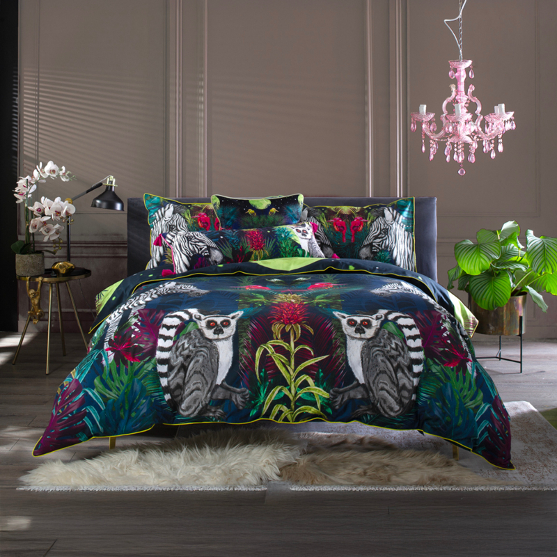 "House of Norris introduces ""Under the Neon Moon"" bedlinen design. An explosion of colour with an array of tropical foliage and fauna in a mirrored format. The Zebra, the Lemur Monkey and the birds with the palm trees depict a night under the fluorescent moon in Zambia with a celebration of fire pineapples. With stunning bright hues on a dark ground the colours pop and create a feast for the eyes. This set of products for your home will enrich your environment and your bedroom. The collection also features cushions and a throw and other exciting products for the home. This is a 200 Thread Count 100% Cotton Duvet set with improved thread count, offering a better feel, higher print quality and improved washing time and time again. The Bedding set comes with a free decorative cushion with a pom pom trim, that matches the bedding set you have chosen (the cushion cover acts as the outer packaging.) The cushion insert you will need is 35cm x 35cm (this is not provided with the set)."