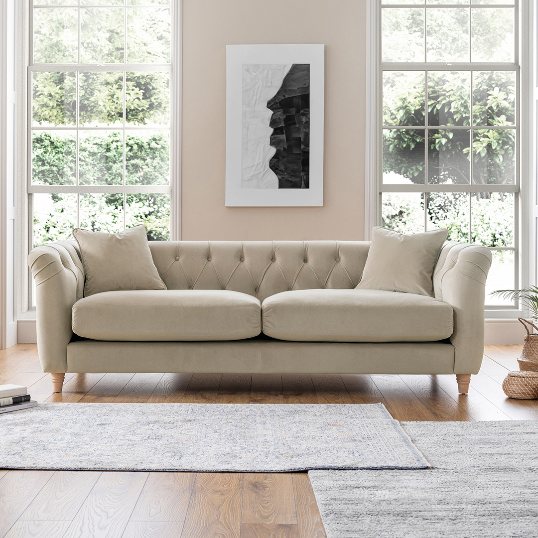 The Soho Sofa a plump and sumptuos sofa range with deep hand buttoning and thick conteporary soft padded arms. Fully reversible seat cushions crafted with an interior core of pocket springs topped off with a blend of feathers and fibre.