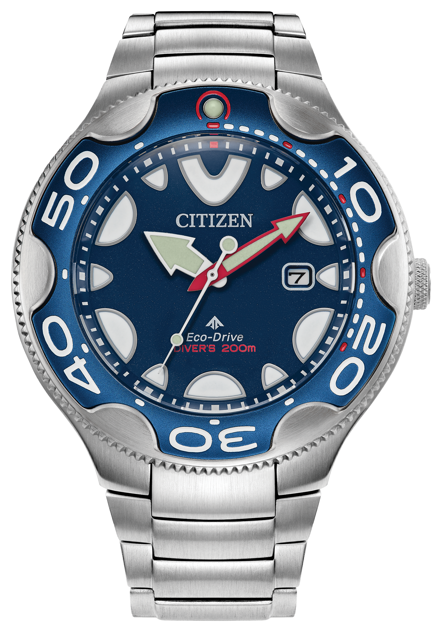 Command the sea in style with the Promaster Dive, featuring a new silver-tone stainless steel bracelet design. This iconic Citizen men’s dive watch is the latest addition to the Promaster Sea collection, with a strikingly original design inspired by the majestic Orca whale. The highly functional, sporty dive timepiece features a silver-tone stainless steel case accented by a blue 3-hand dial and date with elliptical white hour indices and bezel indentations that evoke the shapes of the Orca, plus pops of color at the 12 o’clock marker and minute hand. This ISO-compliant dive watch also features anti-magnetic and anti-shock resistance, a one-way rotating elapsed-time bezel, and luminous hands and markers filled with superior luminosity for legibility. The silver-tone stainless steel bracelet fastens with a fold-over clasp with push buttons, and the watch is water resistant up to 200 meters with a screw-down crown, making it a perfect companion on your next dive. Sustainably powered by any light with Eco-Drive technology that never needs a battery, this is the ultimate dive watch to own and comes in a unique scuba tank-inspired box for the serious diver and collector.