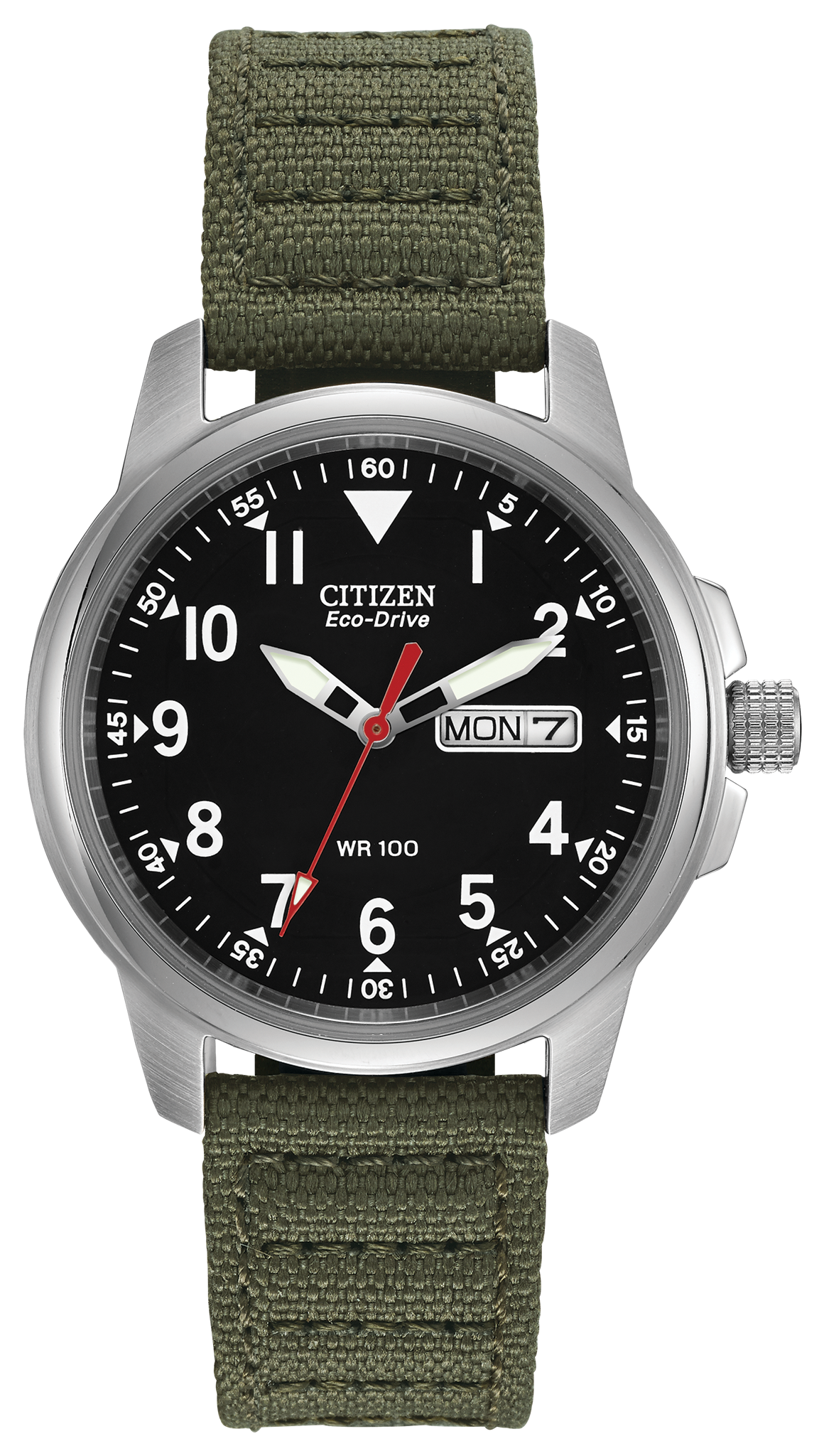 For a rugged look with a comfortable fit, this military-inspired timepiece fits the bill. with a day-date indicator, luminous hands, 37mm screw-back case, and 100M WR. The black dial provides a backdrop for simple Arabic numerals, housed in a stainless steel case along with a woven green strap with patterned stitching and a buckle clasp. Featuring our Eco-Drive technology – powered by light, any light. Never needs a battery. Caliber number E100.