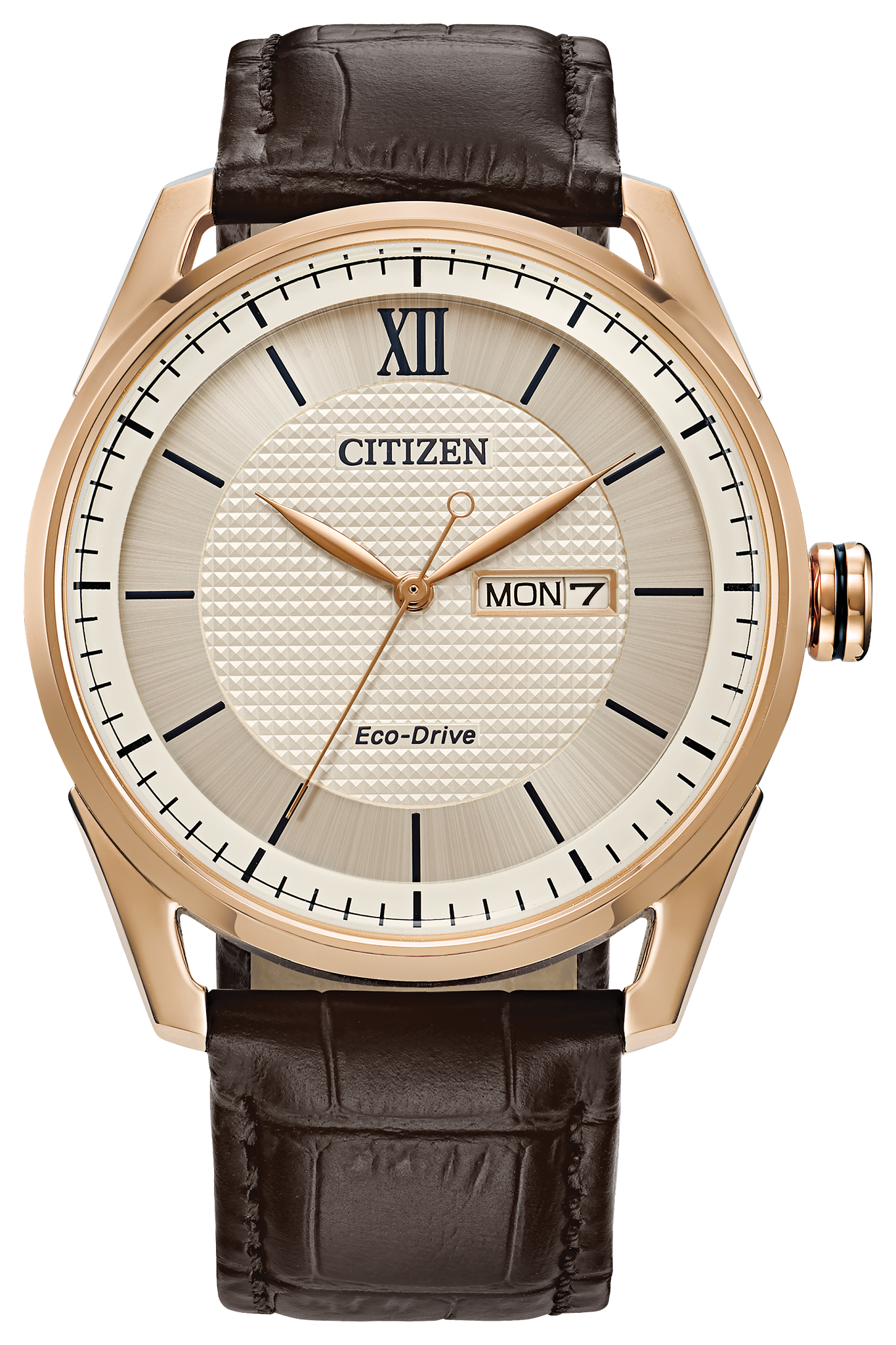 Bring a new elegance to your day with this Citizen timepiece from the Classic collection. Featuring a rose gold-tone stainless steel case and ivory dial with day and date indicator, and a brown embossed leather strap with buckle closure, this watch is also water resistant to 100 meters. This stylish men’s watch is the essential piece to complement your dress wardrobe while adding versatile style to your day to evening looks. Featuring our Eco-Drive technology that is sustainably powered by any light and never needs a battery. Caliber number J800.