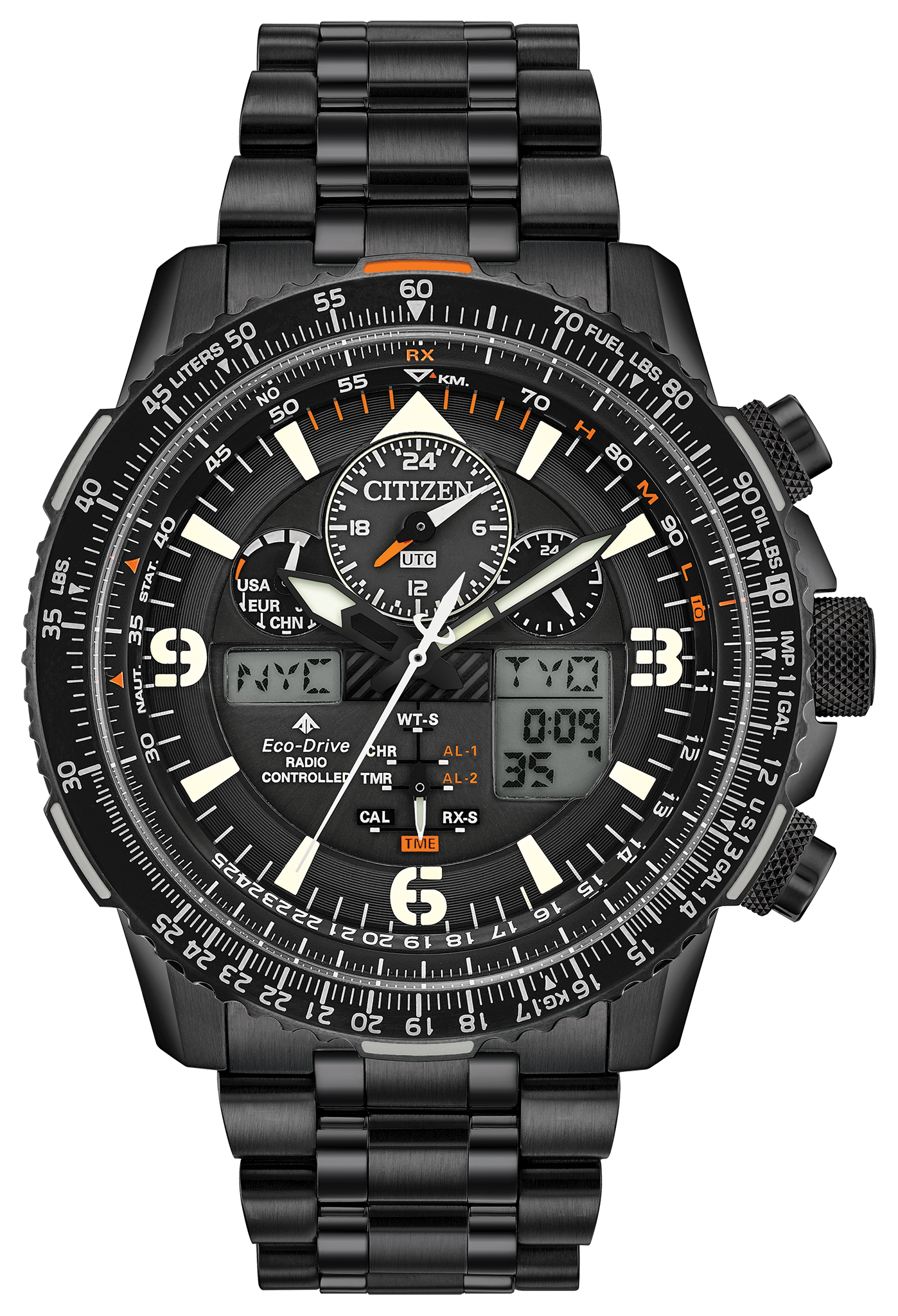 Redefining atomic timekeeping with a turbine inspired bold and powerful timepiece. The newest edition of the CITIZEN Promaster Skyhawk A-T collection is remarkably dynamic and visually appealing. With atomic timekeeping is 43 cities, this chronograph watch features a perpetual calendar, dual time, alarms, countdown timer, digital backlight and UTC displays, power reserve and pilot's rotating slide rule bezel. This model appears with a black ion-plated stainless steel case and bracelet, black dial, bright orange details and black bezel with unique case and dial motifs. Featuring our Eco-Drive technology – powered by light, any light. Never needs a battery. Caliber number U680.