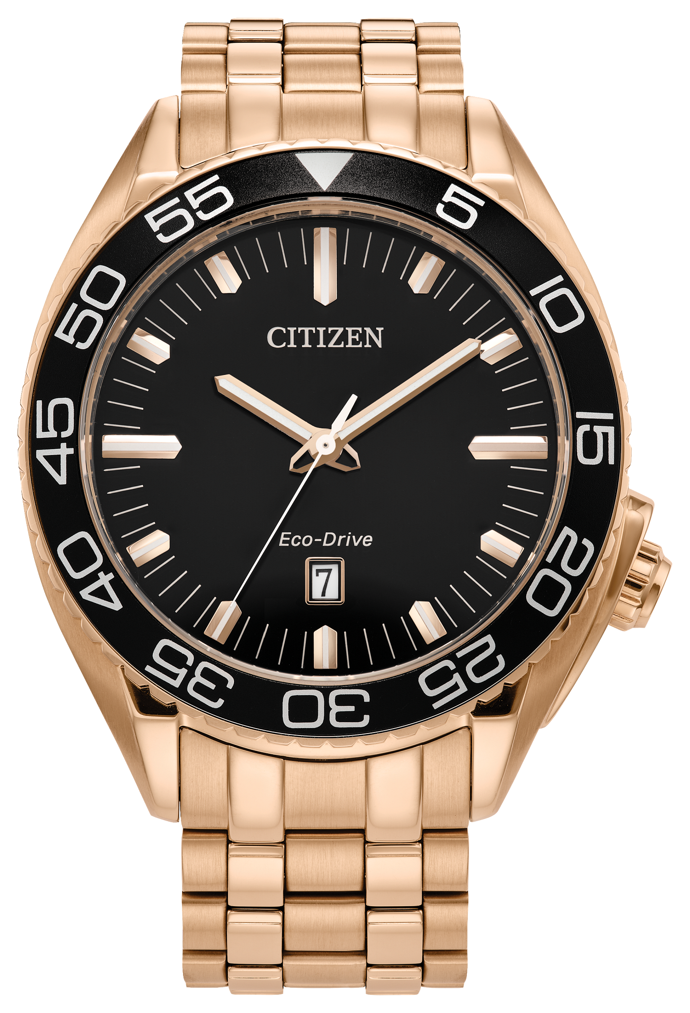Our newest addition to the Sport Luxury collection gives a stylish update to a luxury men’s timepiece. Designed to be versatile yet elevated featuring a rose-gold tone stainless steel case and bracelet with black 3-hand dial encased in sapphire crystal, date function and a deployment clasp with push buttons for easy accessibility. Water resistant to 100 meters and sustainably powered by light with Eco-Drive that never needs a battery. Caliber number J810.