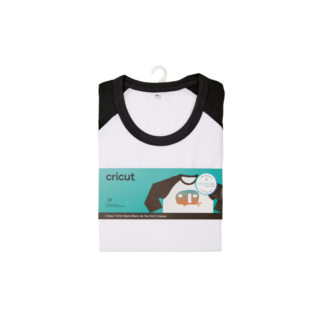 Optimized for Infusible Ink transfers. Your creativity's up at bat with this sporty, soft, baseball-style T-shirt with 3/4 sleeves and a White body. Get vibrant, permanent, pro-quality heat press transfers – no edges or seams. Cricut Infusible Ink blanks are optimized for superior results.* Unlike an iron-on transfer or vinyl application, where artwork is attached on top of a compatible material using adhesive, an Infusible Ink heat transfer becomes one with the material itself. The results are bright, beautiful, seamlessly smooth transfers that are flake-proof, peel-proof, and wash-proof. Personalize it with a team name, a logo, your favorite character, or favorite quote! You've never done a heat press transfer like this before. Care InstructionsMachine wash cold. Do not bleach. Tumble dry low. Iron if needed (medium heat, no steam). Do not dry clean. How it works: Choose your materials. Select Infusible Ink Transfer Sheets or Infusible Ink Pens & Markers and a compatible Cricut blank. Make your design. Cut Infusible Ink Transfer Sheets or draw with Infusible Ink Pens & Markers** using laser copy paper. Apply heat. Transfer design with Cricut EasyPress or heat press. *Can I use generic blanks for my Infusible Ink projects?We took incredible measures perfecting our formula, ensuring that Cricut blanks give you the results we promise with Infusible Ink: vivid, vibrant, seamlessly smooth, and truly permanent heat transfers. If you use blanks that do not bear the Infusible Ink compatibility badge, here’s what you may notice:Less vibrancy and sharpness. Incompatible blanks will not give you the vivid and vibrant colors you should expect from Infusible Ink products. Decreased colorfastness/fading. Infusible Ink designs that get transferred to generic base materials will quickly fade and dull with each wash and/or over time. Imperfections. Incompatible blanks are likely to pill, dimple, and pucker, causing transfers with undesirable imperfections. **Graphics created with Infusible Ink Pens & Markers require Heat Resistant Tape. | Cricut Unisex Adult T-Shirt Blank | Raglan in Black/White | M