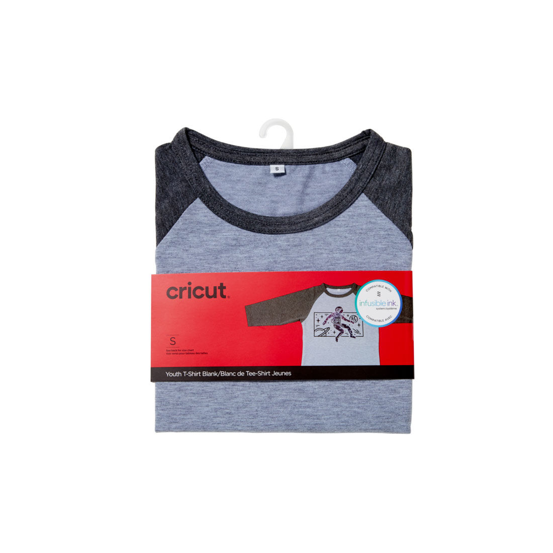 Optimized for Infusible Ink transfers. Your creativity's up at bat with this sporty, soft, baseball-style T-shirt with 3/4 sleeves and a Light Gray body. Get vibrant, permanent, pro-quality heat press transfers – no edges or seams. Cricut Infusible Ink blanks are optimized for superior results.* Unlike an iron-on transfer or vinyl application, where artwork is attached on top of a compatible material using adhesive, an Infusible Ink heat transfer becomes one with the material itself. The results are bright, beautiful, seamlessly smooth transfers that are flake-proof, peel-proof, and wash-proof. Personalize it with a team name, the school mascot, your favorite character, or favorite quote! You've never done a heat press transfer like this before. Care InstructionsMachine wash cold. Do not bleach. Tumble dry low. Iron if needed (medium heat, no steam). Do not dry clean. How it works: Choose your materials. Select Infusible Ink Transfer Sheets or Infusible Ink Pens & Markers and a compatible Cricut blank. Make your design. Cut Infusible Ink Transfer Sheets or draw with Infusible Ink Pens & Markers** using laser copy paper. Apply heat. Transfer design with Cricut EasyPress or heat press. *Can I use generic blanks for my Infusible Ink projects?We took incredible measures perfecting our formula, ensuring that Cricut blanks give you the results we promise with Infusible Ink: vivid, vibrant, seamlessly smooth, and truly permanent heat transfers. If you use blanks that do not bear the Infusible Ink compatibility badge, here’s what you may notice:Less vibrancy and sharpness. Incompatible blanks will not give you the vivid and vibrant colors you should expect from Infusible Ink products. Decreased colorfastness/fading. Infusible Ink designs that get transferred to generic base materials will quickly fade and dull with each wash and/or over time. Imperfections. Incompatible blanks are likely to pill, dimple, and pucker, causing transfers with undesirable imperfections. **Graphics created with Infusible Ink Pens & Markers require Heat Resistant Tape. | Cricut Unisex Youth T-Shirt Blank | Raglan in Dark/Light Heathered Gray | Grey