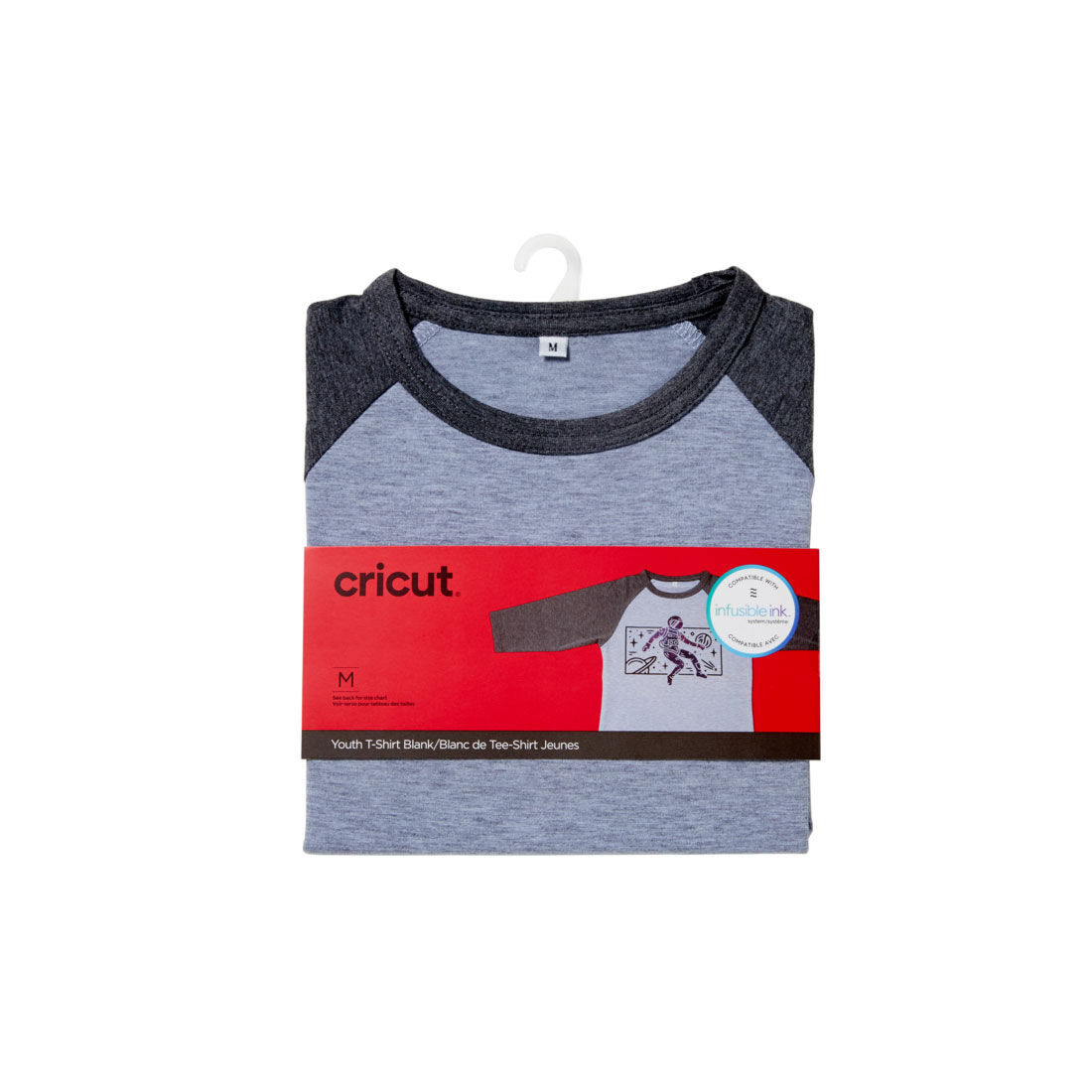 Optimized for Infusible Ink transfers. Your creativity's up at bat with this sporty, soft, baseball-style T-shirt with 3/4 sleeves and a Light Gray body. Get vibrant, permanent, pro-quality heat press transfers – no edges or seams. Cricut Infusible Ink blanks are optimized for superior results.* Unlike an iron-on transfer or vinyl application, where artwork is attached on top of a compatible material using adhesive, an Infusible Ink heat transfer becomes one with the material itself. The results are bright, beautiful, seamlessly smooth transfers that are flake-proof, peel-proof, and wash-proof. Personalize it with a team name, the school mascot, your favorite character, or favorite quote! You've never done a heat press transfer like this before. Care InstructionsMachine wash cold. Do not bleach. Tumble dry low. Iron if needed (medium heat, no steam). Do not dry clean. How it works: Choose your materials. Select Infusible Ink Transfer Sheets or Infusible Ink Pens & Markers and a compatible Cricut blank. Make your design. Cut Infusible Ink Transfer Sheets or draw with Infusible Ink Pens & Markers** using laser copy paper. Apply heat. Transfer design with Cricut EasyPress or heat press. *Can I use generic blanks for my Infusible Ink projects?We took incredible measures perfecting our formula, ensuring that Cricut blanks give you the results we promise with Infusible Ink: vivid, vibrant, seamlessly smooth, and truly permanent heat transfers. If you use blanks that do not bear the Infusible Ink compatibility badge, here’s what you may notice:Less vibrancy and sharpness. Incompatible blanks will not give you the vivid and vibrant colors you should expect from Infusible Ink products. Decreased colorfastness/fading. Infusible Ink designs that get transferred to generic base materials will quickly fade and dull with each wash and/or over time. Imperfections. Incompatible blanks are likely to pill, dimple, and pucker, causing transfers with undesirable imperfections. **Graphics created with Infusible Ink Pens & Markers require Heat Resistant Tape. | Cricut Unisex Youth T-Shirt Blank | Raglan in Dark/Light Heathered Gray | M | Grey
