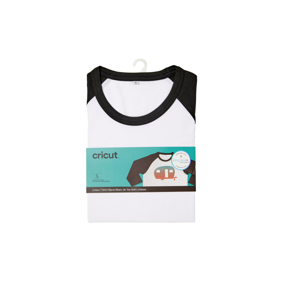 Optimized for Infusible Ink transfers. Your creativity's up at bat with this sporty, soft, baseball-style T-shirt with 3/4 sleeves and a White body. Get vibrant, permanent, pro-quality heat press transfers – no edges or seams. Cricut Infusible Ink blanks are optimized for superior results.* Unlike an iron-on transfer or vinyl application, where artwork is attached on top of a compatible material using adhesive, an Infusible Ink heat transfer becomes one with the material itself. The results are bright, beautiful, seamlessly smooth transfers that are flake-proof, peel-proof, and wash-proof. Personalize it with a team name, a logo, your favorite character, or favorite quote! You've never done a heat press transfer like this before. Care InstructionsMachine wash cold. Do not bleach. Tumble dry low. Iron if needed (medium heat, no steam). Do not dry clean. How it works: Choose your materials. Select Infusible Ink Transfer Sheets or Infusible Ink Pens & Markers and a compatible Cricut blank. Make your design. Cut Infusible Ink Transfer Sheets or draw with Infusible Ink Pens & Markers** using laser copy paper. Apply heat. Transfer design with Cricut EasyPress or heat press. *Can I use generic blanks for my Infusible Ink projects?We took incredible measures perfecting our formula, ensuring that Cricut blanks give you the results we promise with Infusible Ink: vivid, vibrant, seamlessly smooth, and truly permanent heat transfers. If you use blanks that do not bear the Infusible Ink compatibility badge, here’s what you may notice:Less vibrancy and sharpness. Incompatible blanks will not give you the vivid and vibrant colors you should expect from Infusible Ink products. Decreased colorfastness/fading. Infusible Ink designs that get transferred to generic base materials will quickly fade and dull with each wash and/or over time. Imperfections. Incompatible blanks are likely to pill, dimple, and pucker, causing transfers with undesirable imperfections. **Graphics created with Infusible Ink Pens & Markers require Heat Resistant Tape. | Cricut Unisex Adult T-Shirt Blank | Raglan in Black/White | White/Black