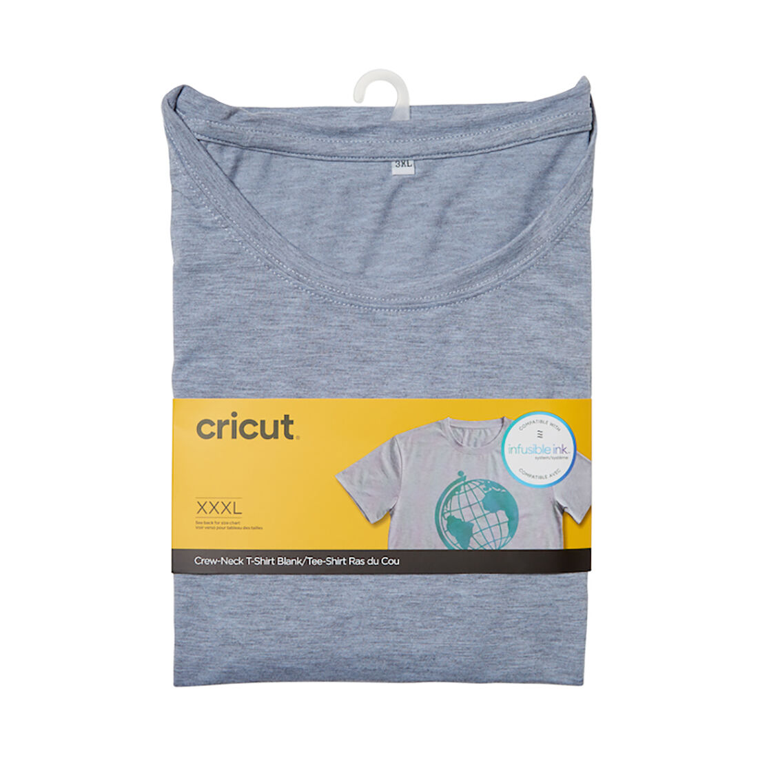 Optimized for Infusible Ink transfers. Give your next T-shirt project a rich background with this exceptionally soft, heathered gray unisex crew-neck blank. Get vibrant, permanent, pro-quality heat press transfers – no edges or seams – on this compatible Infusible Ink blank. Cricut Infusible Ink blanks are optimized for superior results.* Unlike an iron-on transfer or vinyl application, where artwork is attached on top of a compatible material using adhesive, an Infusible Ink heat transfer becomes one with the material itself. The results are bright, beautiful, seamlessly smooth transfers that are flake-proof, peel-proof, and wash-proof. Personalize any compatible Infusible Ink blank with a name, a logo, an inside joke or a favorite quote! Customize with a meaningful heat press transfer that speaks to you. You've never done a heat press transfer like this before. How it works: Choose your materials. Select Infusible Ink Transfer Sheets or Infusible Ink Pens & Markers and a compatible Cricut blank. Make your design. Cut Infusible Ink Transfer Sheets or draw with Infusible Ink Pens & Markers using laser copy paper. Apply heat. Infuse your design into your Cricut blank with Cricut EasyPress *Why should I use a Cricut Infusible Ink blank?We took incredible measures perfecting our formula, ensuring that Cricut blanks give you the results we promise with Infusible Ink: vivid, vibrant, seamlessly smooth, and truly permanent heat transfers. If you use blanks that do not bear the Infusible Ink compatibility badge, here’s what you may notice:Less vibrancy and sharpness. Incompatible blanks will not give you the vivid and vibrant colors you should expect from Infusible Ink products. Decreased colorfastness/fading. Infusible Ink designs that get transferred to generic base materials will quickly fade and dull with each wash and/or over time. Imperfections. Incompatible blanks are likely to pill, dimple, and pucker, causing transfers with undesirable imperfections. *Graphics created with Infusible Ink Pens & Markers require Heat Resistant Tape. | Cricut Unisex T-Shirt Blank | Crew Neck | 3XL | Grey