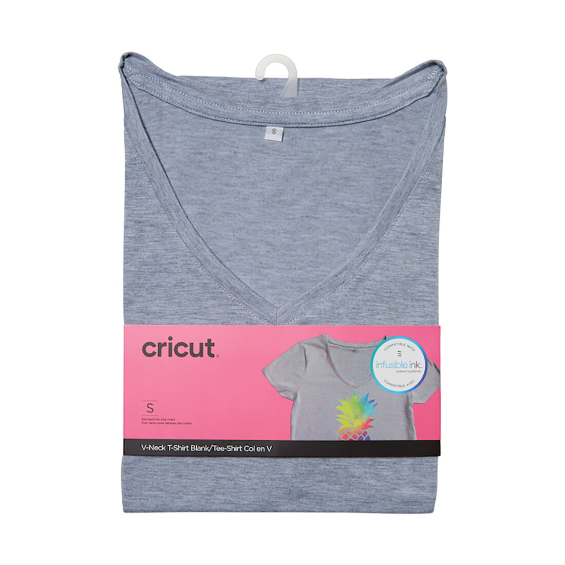 Optimized for Infusible Ink transfers. This exceptionally soft, heathered gray women's V-Neck T-shirt is a blank canvas for your creativity for projects that will stand the test of time! Get vibrant, permanent, pro-quality heat press transfers – no edges or seams – on this compatible Infusible Ink blank. Cricut Infusible Ink blanks are optimized for superior results.* Unlike an iron-on transfer or vinyl application, where artwork is attached on top of a compatible material using adhesive, an Infusible Ink heat transfer becomes one with the material itself. The results are bright, beautiful, seamlessly smooth transfers that are flake-proof, peel-proof, and wash-proof. Personalize any compatible Infusible Ink blank with a name, a logo, an inside joke or a favorite quote! Customize with a meaningful heat press transfer that speaks to you. You've never done a heat press transfer like this before. How it works: Choose your materials. Select Infusible Ink Transfer Sheets or Infusible Ink Pens & Markers and a compatible Cricut blank. Make your design. Cut Infusible Ink Transfer Sheets or draw with Infusible Ink Pens & Markers using laser copy paper. Apply heat. Infuse your design into your Cricut blank with Cricut EasyPress *Why should I use a Cricut Infusible Ink blank?We took incredible measures perfecting our formula, ensuring that Cricut blanks give you the results we promise with Infusible Ink: vivid, vibrant, seamlessly smooth, and truly permanent heat transfers. If you use blanks that do not bear the Infusible Ink compatibility badge, here’s what you may notice:Less vibrancy and sharpness. Incompatible blanks will not give you the vivid and vibrant colors you should expect from Infusible Ink products. Decreased colorfastness/fading. Infusible Ink designs that get transferred to generic base materials will quickly fade and dull with each wash and/or over time. Imperfections. Incompatible blanks are likely to pill, dimple, and pucker, causing transfers with undesirable imperfections. *Graphics created with Infusible Ink Pens & Markers require Heat Resistant Tape. | Cricut Women's Fitted T-Shirt Blank | V-Neck | Grey