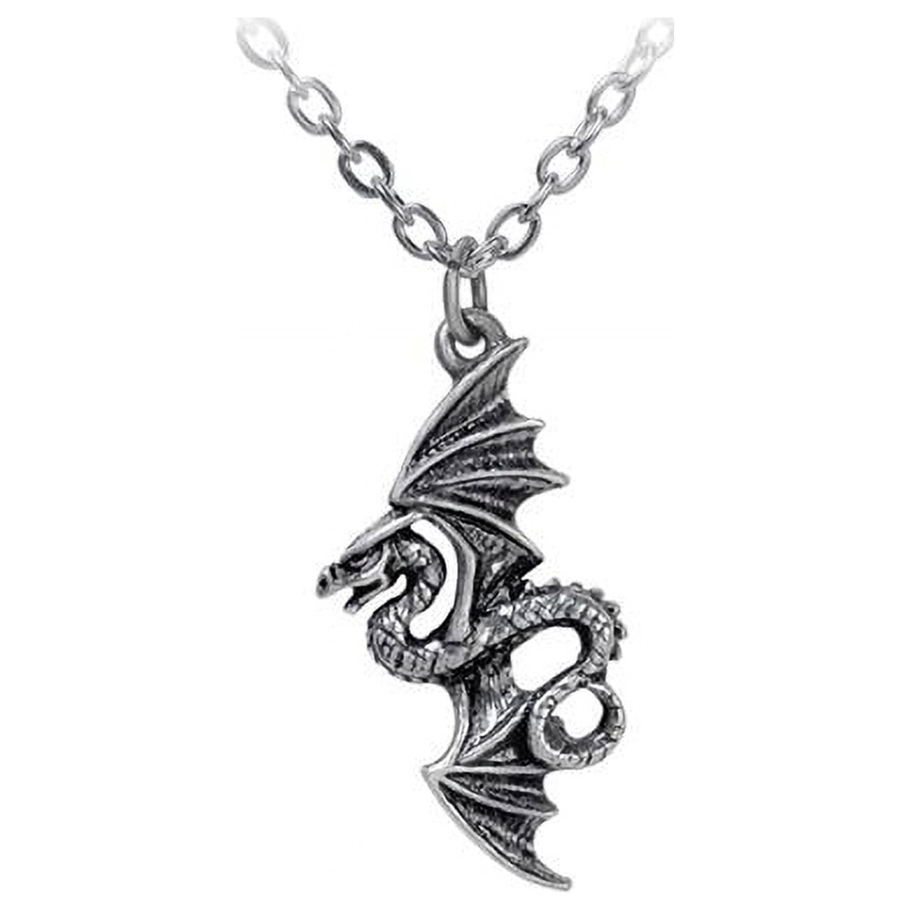 The distant shape of a profound wonder, the giant creature seen soaring the skies in legends of old from times before offerings of iron were given up to the waters. A small, 1.25 in. long antiqued pewter pendant of a flying dragon with wings outstretched. On an 18 in. fine curb chain.