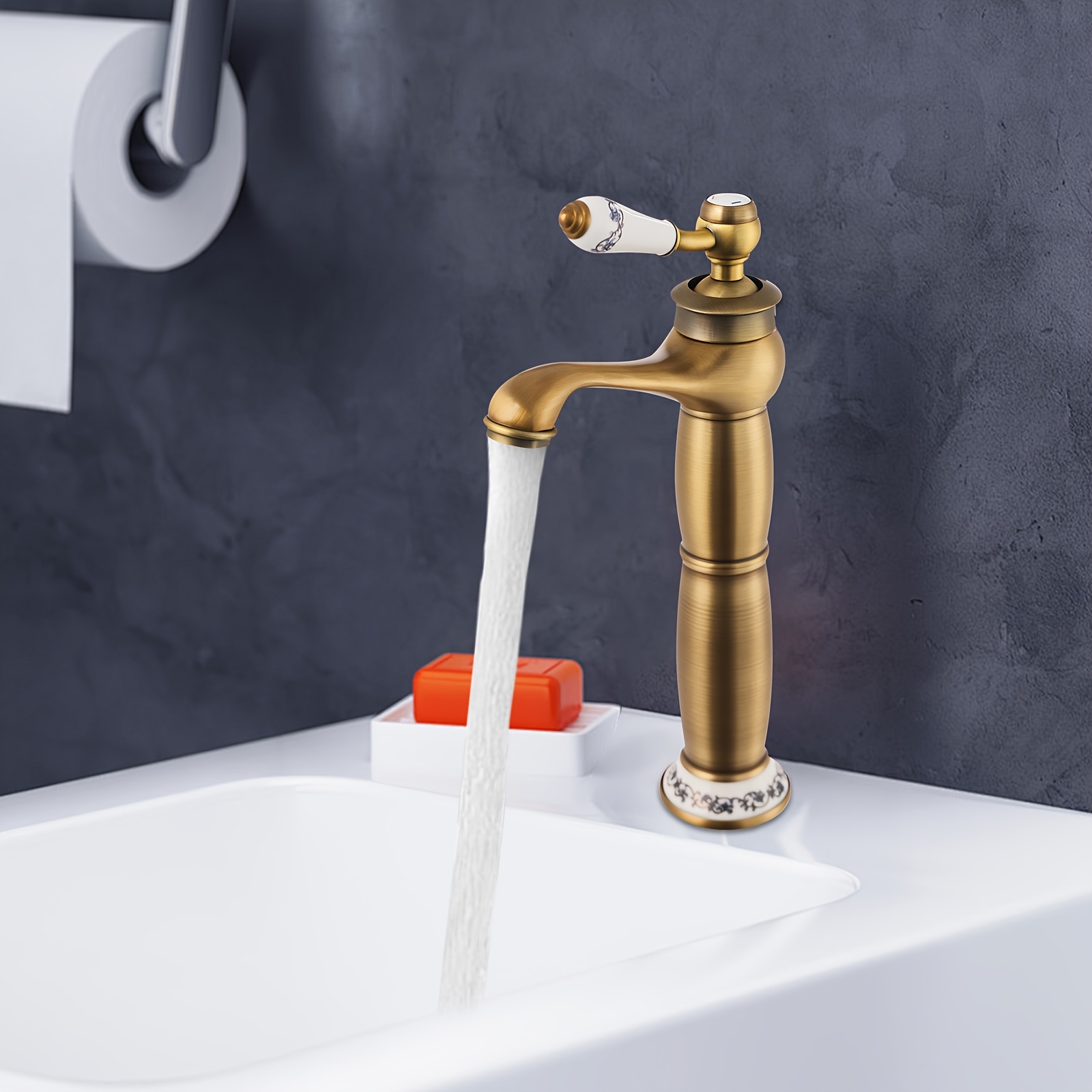 TEMU Vintage Messing Waschtischarmatur mit Blau-We...