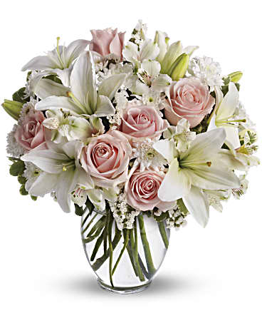 Make a lasting impression with the Arrive In Style Bouquet from Teleflora, a stunning floral arrangement designed to convey your heartfelt messages with elegance and grace. This fashionable and feminine bouquet is perfect for any special occasion, combining soft pink roses, pristine white lilies, delicate alstroemeria, and charming cushion spray chrysanthemums. Each bloom is thoughtfully selected to create a full, fragrant display that radiates romance and sophistication.
