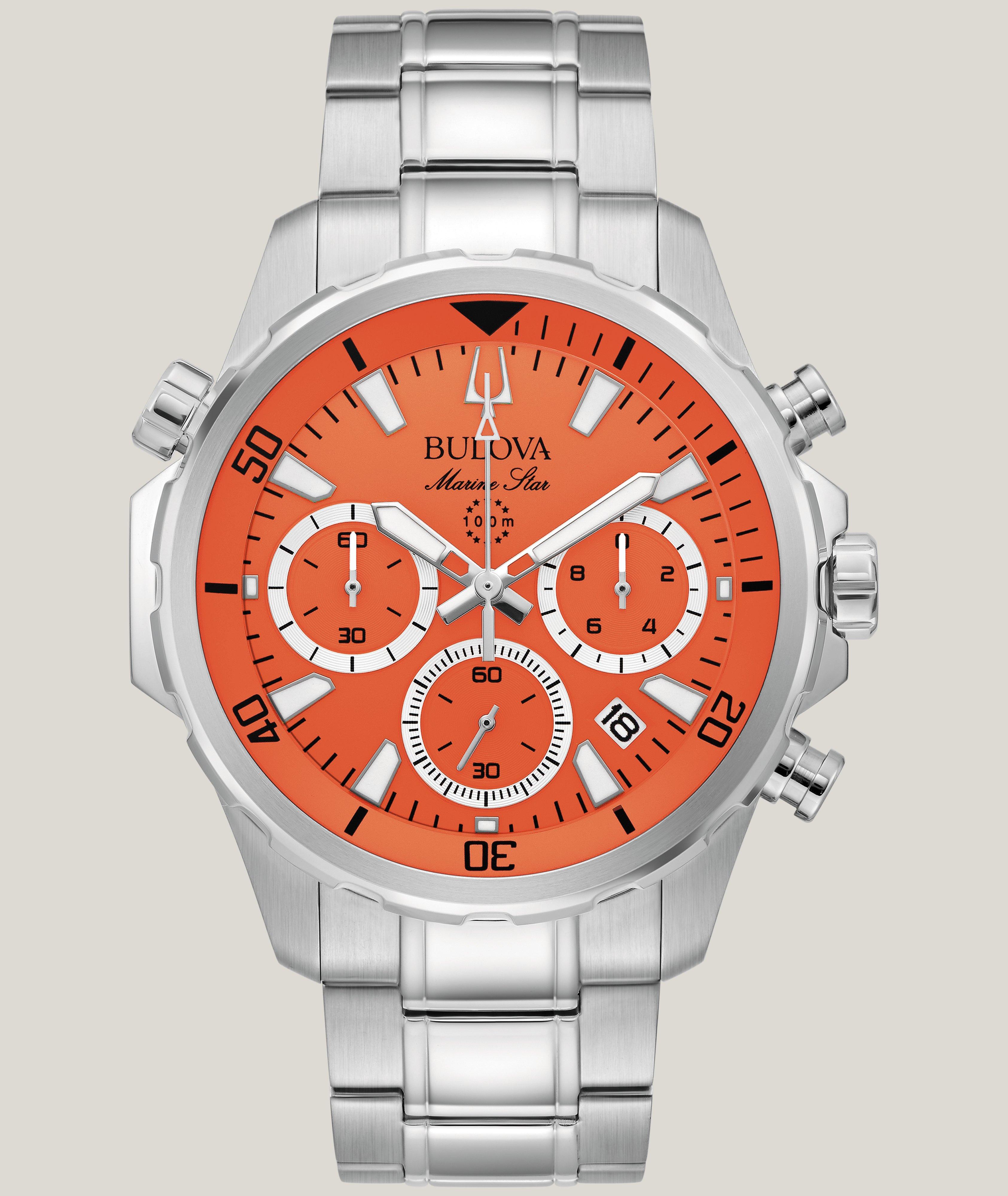 This new men’s six-hand chronograph watch from the Marine Star Collection delivers the vibrancy of the sea with the ruggedness required by those who wish to explore it. The silver-tone stainless steel case features a balance of brushed and polished facets, a flat mineral crystal, and a pull-out crown achieving 100m water resistance. The dial is a refreshing burst of orange with black accents, inspired by vintage Bulova timepieces, featuring silver-tone polished stainless steel hands and applied markers, all of which have been treated with luminescent material for low-light legibility. The dial features a running seconds sub-dial, with a central chronograph seconds hand and 60-minute and 1/20 seconds chronograph sub-dials. The dial is completed with an internal rotating 60-minute timingcase ring, operated by the crown at 10 o’clock. The watch is fitted with a matching silver-tone stainless steel bracelet with brushed and polished finishing and an extendable sport fold-over clasp with pushers and a safety bar. Calling to mind marine life and equipped with the functionality befitting an explorer, this Bulova men’s timepiece is ideal for the seafaring adventurer. | Bulova Marine Star Watch In Grey
