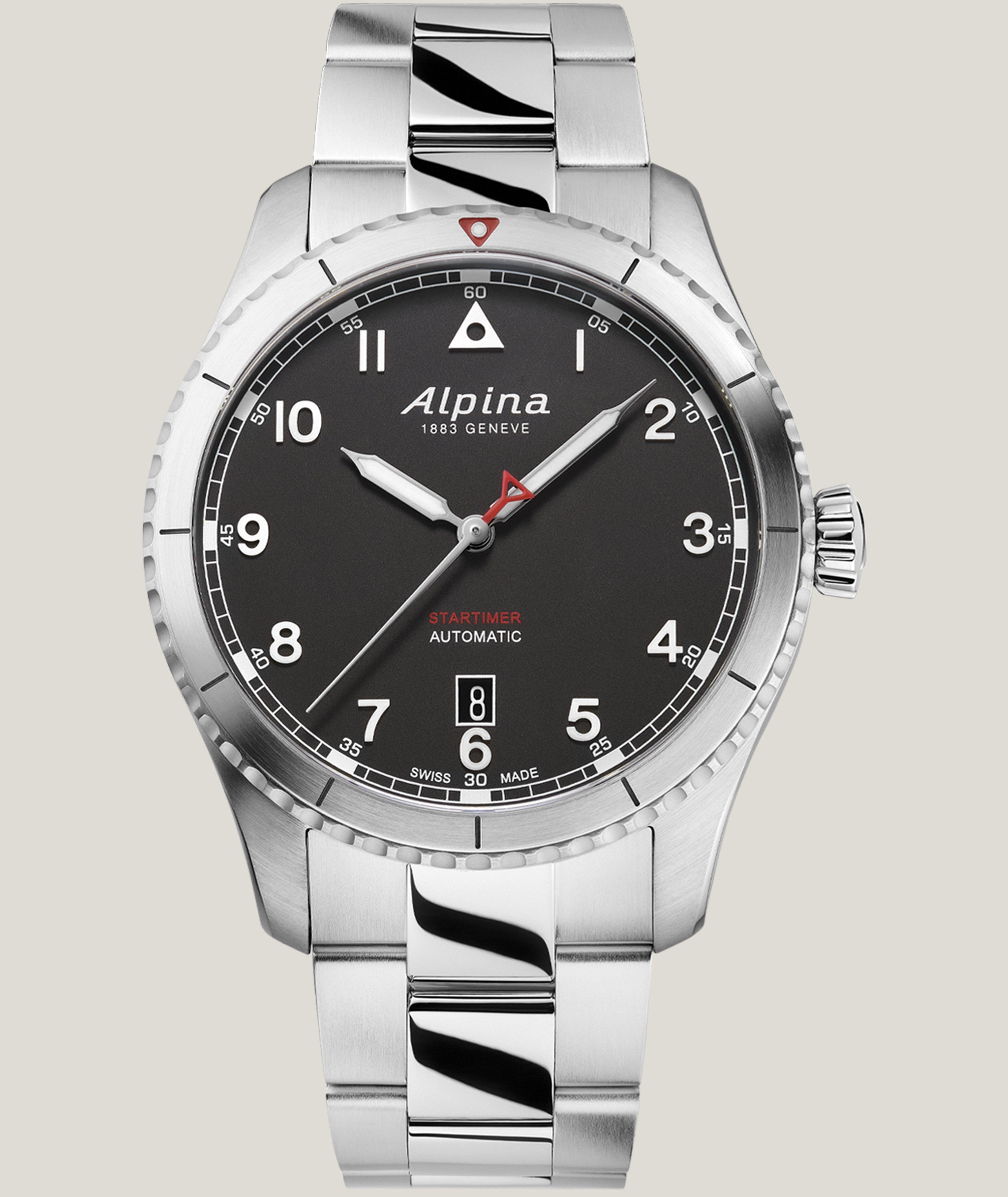 The Alpina Startimer Automatic, inspired by its heritage look and incomparable precision, features a 41mm brushed and polished 2-part stainless steel case, designed in the early days of aviation, making it easier to grip with gloves. WR to 100M, with a black dial featuring a date window at 6 o'clock. Outer ring with seconds graduation. Set on a stainless steel 3-link bracelet. Perfect for the aviator at heart. | Alpina Startimer Pilot Automatic Watch