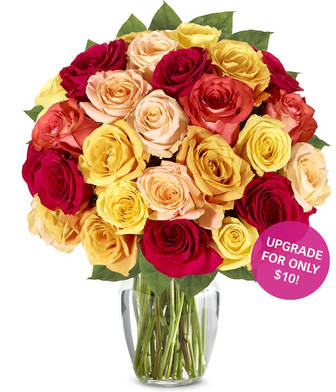 Send them beautiful flowers reflecting the colors of Autumn. This bouquet features two dozen assorted roses in red, yellow, and orange in an optional glass vase. It's sure to being a warm smile to their face. Includes: Orange Roses Red Roses Yellow Roses Glass Vase (Optional) Personalized Card Message