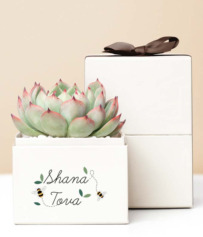 Celebrate this festive religious time with a gorgeous succulent planter to bring joy in the new year. Wish them a shana tova and a year of good luck on this holy day. Each purchase of a Lula's Garden planter provides six months' worth of safe water for one person in the developing world via water.org. These chic suncatchers can adapt to various indoor climates. They will thrive with lots of indirect light and watering every 7-10 days. Water each plant with 2-4 full droppers using the included plastic dropper. Please note: Succulent selection may vary from those listed or depicted here due to availability. Includes: 4" Echeveria Succulent Plant Plastic Dropper Sleeve with Black Bow 4" x 5.7" Shana Tova Planter Personalized Card Message