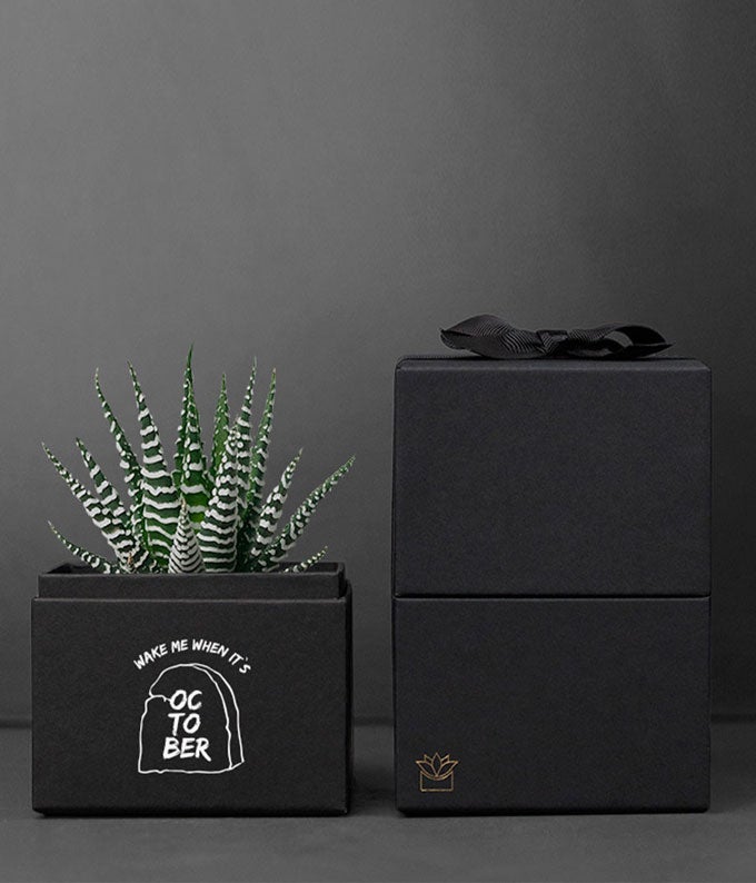 Spooky season is here! Send a charming trick or treat succulent planter to your friend or loved one to help them keep the spooky season going all year! Each purchase of a Lula's Garden planter provides six months' worth of safe water for one person in the developing world via water.org. These chic suncatchers can adapt to various indoor climates. Please note: Succulent selection may vary from those listed or depicted here due to availability. Includes: 4" Haworthia Succulent Plant Plastic Dropper Black Gift Box with Black Bow 4" x 5.7" Black Planter with white tombstone illustration "Wake me when it's October" Personalized Card Message Plant Care: Direct sunlight, move to indirect sunlight when it's hotter Water when top inch of soil dries. Do not let fully dry.