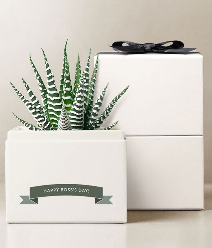 Show your favorite manager or supervisor how much you appreciate their guidance and leadership style with a natural succulent gift for Boss's Day. Each purchase of a Lula's Garden planter provides six months' worth of safe water for one person in the developing world via water.org. These chic suncatchers can adapt to various indoor climates.Please note: Succulent selection may vary from those listed or depicted here due to availability. Includes: 4" Haworthia Succulent Plant Plastic Dropper White Gift Box with Bow 4" x 5.7" Happy Boss's Day Planter Personalized Card Message Plant Care: Direct sunlight, move to indirect sunlight when it's hotter Water when top inch of soil dries. Do not let fully dry.