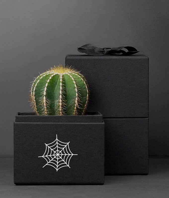 Spooky season is here! Send a charming trick or treat succulent planter to your friend or loved one to help them keep the spooky season going all year! Each purchase of a Lula's Garden planter provides six months' worth of safe water for one person in the developing world via water.org. These chic suncatchers can adapt to various indoor climates. Please note: Succulent selection may vary from those listed or depicted here due to availability. Includes: 4" Parodia Cactus Succulent Plant Plastic Dropper Black Gift Box with Black Bow 4" x 5.7" Black Planter with White Spiderweb Illustration Personalized Card Message Plant Care: Direct sunlight in morning and evening, indirect sun during hotter afternoon hours In Spring & Summer months: Water regularly, keeping soil moist. In Winter months: Water roughly every 1-2 weeks, allowing soil to dry between watering