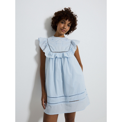 Blue Embroidered Frill Mini Dress with Side Pocket...