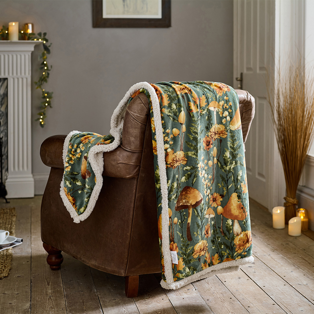 Embrace the colder seasons with the Deyongs Mushroom Sage Sherpa Fleece Throw. Featuring a rich forest-inspired print with golden mushrooms, foliage and earthy tones, this soft fleece layer is ideal for curling up in comfort as the seasons change.Made with a smooth 2200gsm printed fleece front and a cosy Sherpa backing, it delivers warmth without weight. The size makes it perfect for draping over a chair or layering across your bed, adding texture and charm to any room. It's also practical—machine washable for everyday use and care. Dimensions: 140 x 180cm Materials: 100% Polyester Key features: Special heat-retaining fibres for added warmth. Supersoft finish with a light, breathable feel. Energy-saving comfort, ideal for colder seasons Care instructions: Machine washable at 40°C