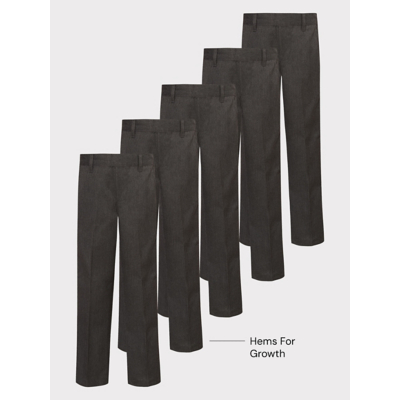 • 5 pack • Regular leg • 2 side pockets • Elasticated waistband • Hems for Growth • Reinforced knees • Permanent front crease • 3-4 years to 6-7 years feature a mock fly front • 7-8 years and up feature hook & eye and zip fastening