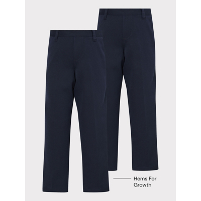 •2 Pack •Regular leg •Hems for Growth •Elasticated waistband •Reinforced knees •2 side pockets •Permanent front crease •3-4 years to 6-7 years feature a mock fly front •7-8 years & up feature hook & eye and zip fastening