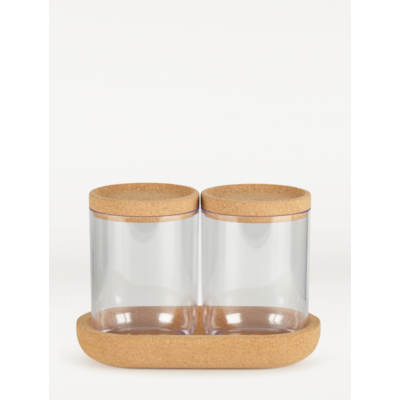 From cotton balls to bath salts, keep your bits and bobs in this chic canister set from George Home. Designed with cork lids and presented on a matching tray, it's perfect for popping on the side of the bath or on a shelf. • W 12 x D 8 x H 1.5cm • 70% plastic, 20% cork