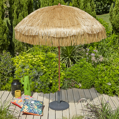 Soak up the sun in Hawaiian style with this Tiki Beach parasol from George Home. Designed with a raffia effect top, this parasol features a simple push up and down function to make it extra easy to operate. • Natural effect with brown powder coated frame • Height adjustable • Handy carry bag