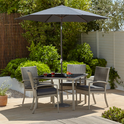 With everything you need to create a great outdoor area for dining, entertaining or relaxing, this Jakarta 6 piece patio set combines traditional style with durable modern materials. With chic, classic charcoal grey tone fabric, the set includes 4 armchairs with seat cushions, a colour matched 2.4m parasol and a 100 x 100cm table with a toughened glass top. • 4 armchairs • 100 x 100cm table • Double coated steel frame for improved corrosion resistance • Hand woven textured grey poly rattan weave • Toughened safety glass table top • Charcoal exterior grade spun polyester seat cushions with removable covers • 2.4m parasol with crank handle mechanism and head tilt • Assembly required Made from double costed steel with a hand woven rattan finish, this 6 piece Jakarta set contains everything to create an instant outdoor dining and relaxing space. The signature Jakarta woven design comes with complementary charcoal grey seat cushions and a charcoal grey parasol to help keep the sun off, while the toughened glass tabletop offers an easy clean surface that's stylish and durable at the same time. We recommend the use of a parasol base for added stability (sold separately), otherwise your parasol may overturn your table. :: Customer Review = 3.7
