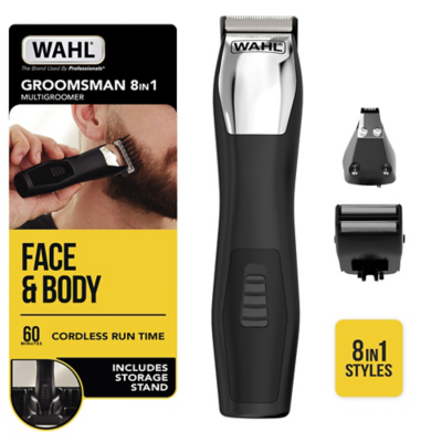 The Wahl Groomsman 8 in 1 Multigroomer is a sleek, rechargeable trimmer, with professional quality precision ground blades. Three interchangeable heads allow for beard and body grooming. With 60 minutes cordless run time delivering plenty of power for a full body groom. MULTIFUNCTIONAL Three interchangeable heads allow for precision beard trimming, close shaving, detail trimming as well as ear and nose hair removal. VERSATILE Four guide combs provide trimming lengths from 1.5mm - 12mm to create your desired look. For a closer cut, use without the combs to achieve an overall length of 0.5mm. Get a close shave of just 0.2mm using the mini foil shaver head.