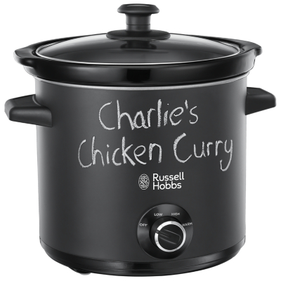 Russell Hobbs Chalk Board Slow Cooker - the first word in creative cooking Make a note - this generous 3.5 litre slow cooker is perfect for family meals The Russell Hobbs Chalk Board Slow Cooker in stylish Matt Black is a cookpot with a twist. As well as providing all the advanced and clever features that make Russell Hobbs Slow Cookers indispensable, the Chalk Board housing means you can write on it too. Whether you want to leave little notes for the family telling them what's for dinner or you want to keep track of a recipe - this creative concept will get everyone talking. Perfect for stews, roasts, chillis, soups and more If you're cooking for up to four people, this family-sized, 3.5 litre cooker really can make your life easier. Not only can you come home to a tasty, nutritious pre-prepared meal, but you don't have the hassle and mess that comes with using additional pans, grills or the oven. One compact pot does the lot. Enjoy delicious home cooked meals, ready when you are It's great for people who want to enjoy nourishing meals but simply don't have the time, energy or inclination to prepare ingredients at the end of a busy day. It's also ideal if you want to leave heart-warming family favourites for others to enjoy when you're out and about. Simply prepare the ingredients earlier in the day, set the timer and everything will be ready when you're ready to eat. Considered to be an easier, healthier, more economical way to cook Slow cooked meat can make mealtimes tastier. The gentle cooking action reduces damage to vitamins and retains more of your food's nutrients and flavours. It makes the most of your budget too because long, slow cooking can tenderise cheaper, tougher cuts of meat, and uses about a quarter of the power of the small ring on the average hob. Stylish Matt Black Powder Coated casing - taste with a twist of fun. The Russell Hobbs Chalk Board Slow Cooker has three simple heat settings; high, low and warm making it easy to operate. A glass lid lets you view your food while its cooking, and cool touch handles on the main body make it safe to handle. Add to that its modern matt black powder coated finish that you can write on using chalk and you have a thoroughly modern, versatile appliance that will enhance any home at mealtimes. Chalk Board Casing Matt black powder finish allows you to write on the sides of the pot using chalk. Leave messages for the family, tell them what's cooking or keep a note of your ingredients or timings if you're following a recipe. 2 Pieces of Chalk Comes complete with its own chalk to make leaving notes easier. Cooks up to 4 portions Its generous 3.5 litre pot means it can cook a nutritious and filling meal for all the family. Removable pot and lid It has a dishwasher safe removable pot and lid for easy cleaning after every use. 3 simple settings Its simple settings make it really easy to use - it's quick way to have your family dinner on the table at the end of a busy day Product Features •3.5L capacity slow cooker •Ideal family size slow cooker, cooks up to 4 portions of food •Matt Black Chalk powder coating •2 pieces of chalk that can be used to write on the body •3 heat settings, high, low, warm •Glass lid to view food whilst cooking •Removable black ceramic pot & lid for easy cleaning •Power indicator light •Non slip feet :: Customer Review = 4.7
