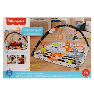 The Fisher-Price 3-in-1 Music, Glow and Grow Gym activity play mat is the place for your little one to 'glow up' their playtime. Newborns can reach, bat, and grasp 5 linkable activity toys including a mirror, soft rattle hedgehog toy, BPA-free snail teether, crinkle rainbow toy, and a music and lights otter. The music and lights otter plays 15 minutes of music and shines a soft-glowing light to make playtime otter-ly fun on or off the mat! As your baby grows, remove the two arches for tummy time on the large, comfy mat, so they can push up and engage those neck and core muscles. Plus, the gym's high-contrast colors can help with baby's earliest visual development. :: Customer Review = 4.7