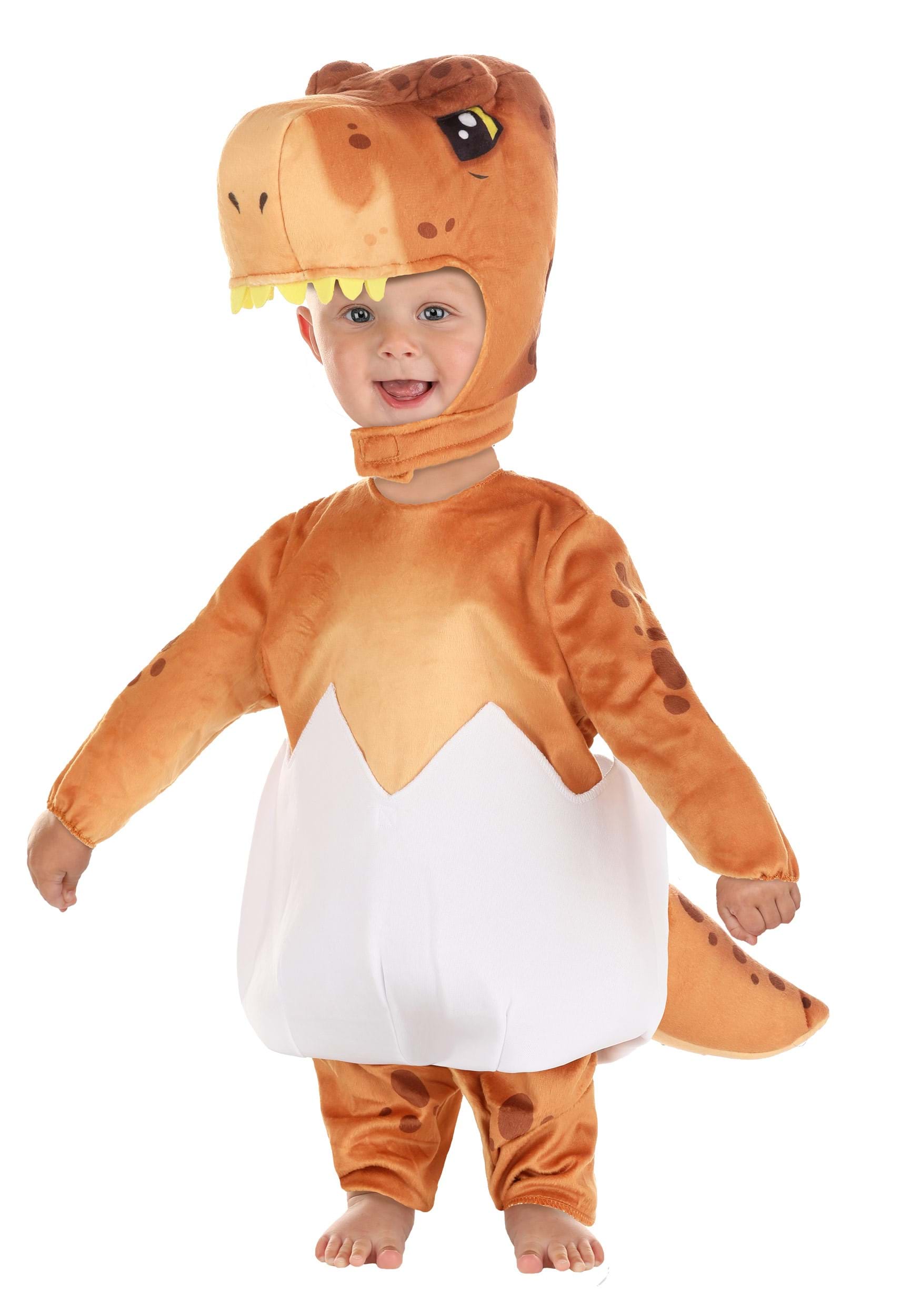 No animal at the famous dinosaur theme park has ever been as adorable as your child will be while wearing this officially licensed Infant Jurassic World T-Rex Hatchling Costume! The outfit includes a jumpsuit made of soft orange-brown fabric and printed with brown speckles on the sleeves, legs, and attached soft-sculpted tail. An white fabric eggshell accessory secures over the waist and upper legs, so that it looks as though your child is peeking out of a cracked egg. The matching hood fastens under the chin and is decorated with printed eyes, a soft-sculpted snout, and fabric dino teeth.