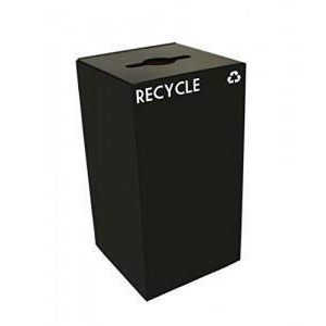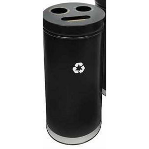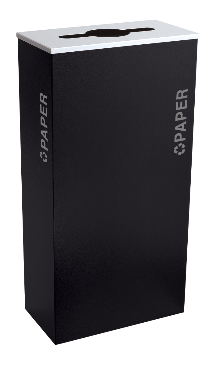 Black Tie series KD 17 gal recycling receptacle, comingle opening, silver Paper decals, platinum lid, pebble black body.