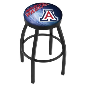 This Arizona Wildcats bar stool would be a great addition to any game room or den. Our L8B2B 36 high contemporary style Arizona swivel bar stool has a 2.5 cushioned seat with a black accent ring to give it a unique look. The Wildcats officially licensed logo is applied using a detailed screen printing process. The heavy duty steel black wrinkle base has one round ring for additional stability. These Arizona bar stools have individual foot levelers and will look great in any indoor environment. Make your bar or game room come alive with these Wildcats bar stools. Make sure to complete your game room with a matching logo pub table. FeaturesArizona Wildcats LogoDetailed screen printedBlack wrinkle base350 lbs weight capacityMade in USASpecificationsLeague: NCAATeam Name: Arizona WildcatsOverall Height: 36 Weight: 42 lbs