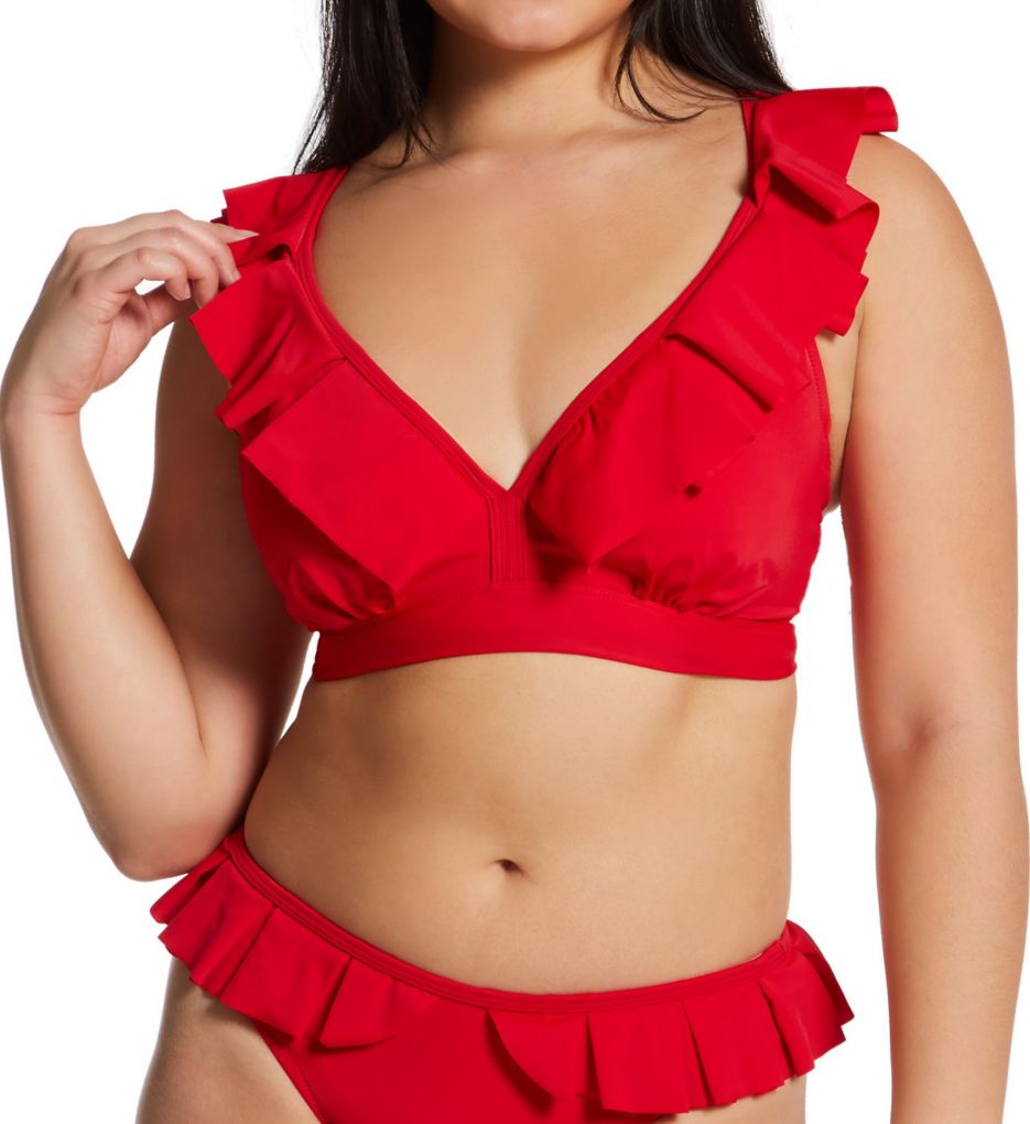 Discover endless styling possibilities with this vibrant red convertible bikini top from Pour Moi, specially designed for 32D busts. The hidden underwire provides exceptional support while maintaining comfort during all your water activities. Transform your look with multiple strap configurations - wear it as a halter for maximum lift, go strapless for uninterrupted tanning, or create a fashionable crisscross back design. Delicate frill accents add a feminine flair to the bold red color, making this swim top a versatile centerpiece for your beach wardrobe. Crafted with quality materials that maintain their vibrant hue through repeated wear and washing, this convertible top adapts to your every swimwear need. HerRoom brings you swimwear that combines fashion flexibility with reliable support, ensuring you feel confident and stylish whether you're swimming, sunbathing, or simply enjoying the water.