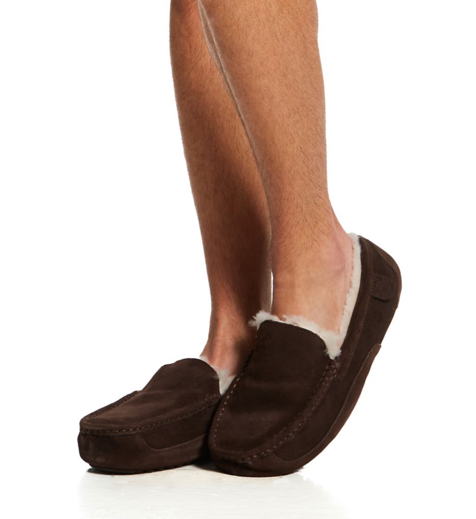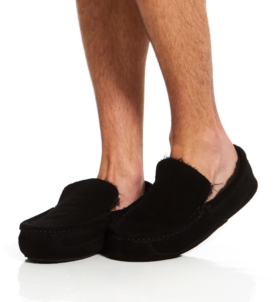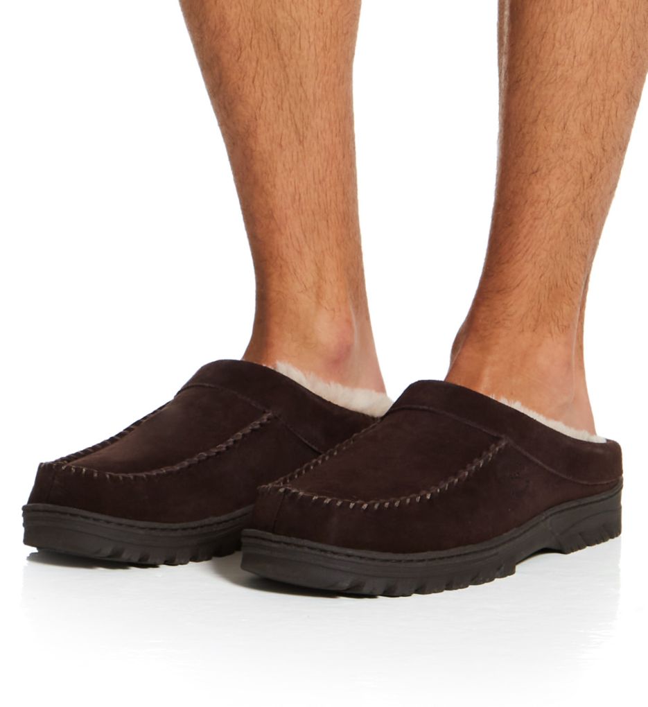 Indulge in luxury with these Dearfoams moccasins, crafted from cow suede and lined with genuine Australian shearling. The moisture-wicking lining keeps feet dry, while the rugged rubber sole ensures durability and traction. Designed for year-round comfort, these slippers run a half size small—order up if between sizes. A perfect blend of style and warmth for any man's downtime.