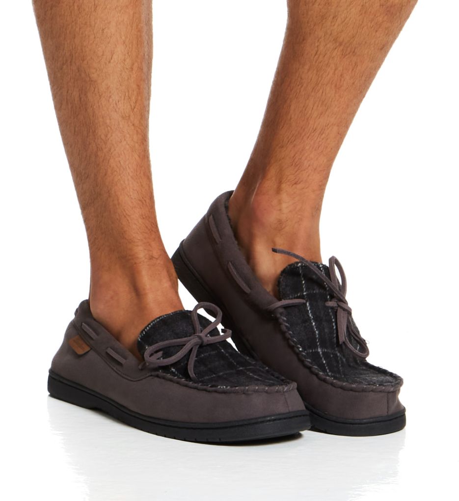 Enjoy classic comfort with these Dearfoams microfiber suede moc slippers. The suede-look exterior and functional faux leather laces offer timeless style, while the fleece-lined interior with memory foam provides cushioned support. The TPR outsole ensures no-slip grip, making them suitable for indoor and outdoor wear. Breathable and lightweight for year-round use.