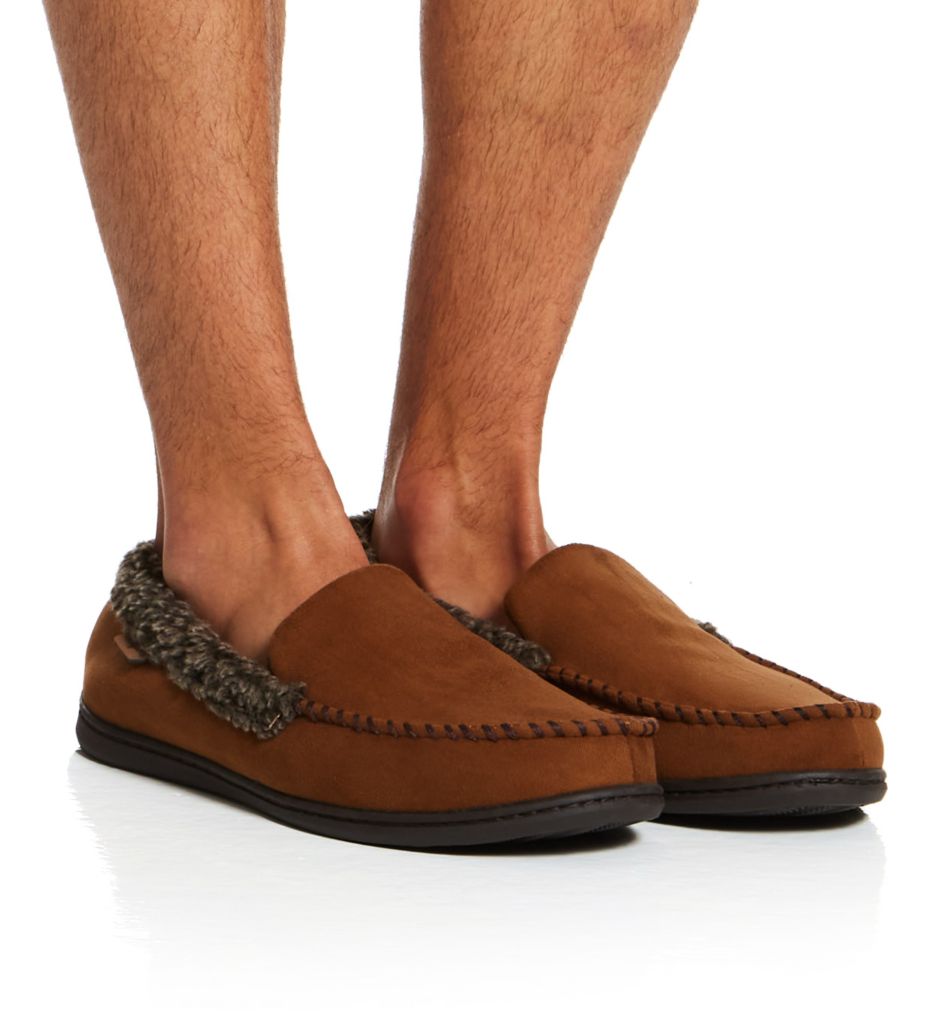 Enjoy ultimate comfort with these Dearfoams moc slippers. The faux suede upper and shearling-style fleece lining create a snug fit, while the memory foam insole adapts to your foot for superior support. The textured TPR outsole provides traction, and the breathable materials keep feet fresh. Machine washable for easy care, these slippers are perfect for indoor or outdoor wear. A stylish and practical choice for any man.