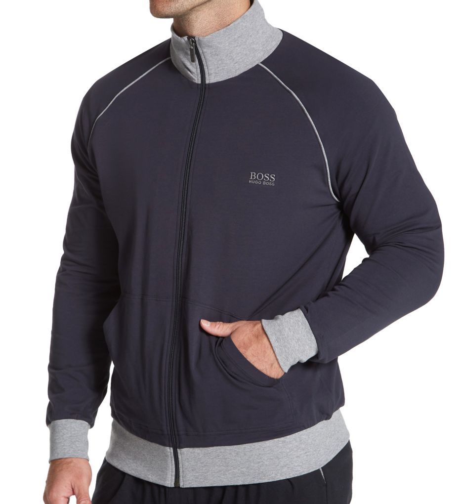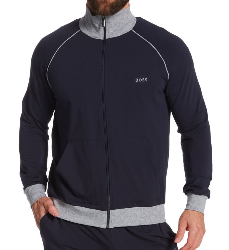Sporty lounge jacket has the feel of a tee, and is carefully styled so that you can easily run an errand in it. Made of a knit blend of cotton and elastane. Tall mock neck collar in contrast heather gray. Zipper closure at front entends from top of collar to bottom of hem. Long sleeves with contrast heather gray piping and cuffs. Split kangaroo-style pockets at front. Embroidered Boss Hugo Boss logo on left side of chest. Heather gray cuff at hem. Lightweight knit cotton adds a comfortable layer of warmth without overheating you. Boss Hugo Boss Men's Boss Hugo Mix & Match Full Zip Jacket, Navy Blue/Navy (0379013) S in Blue (0379013) | Size Small | HisRoom.com
