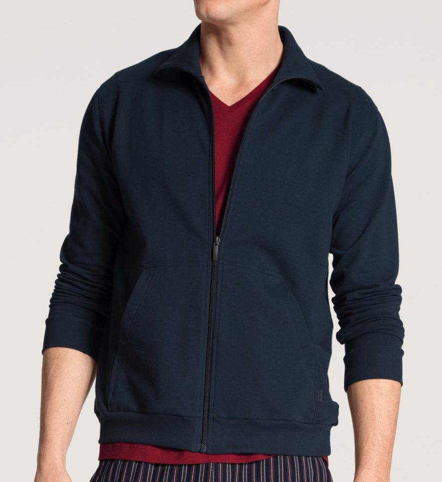 Feel relaxed and look put together with this updated warm-up style jacket that's just a little more sophisticated than a hoody, and no less comfortable. Made of a knit cotton with elastane. Full, soft and relaxing French terry interior. Ribbed standard collar. Zipper closure at front runs from hem to top of collar. Long sleeves have ribbed cuffs. Split kangaroo pocket with terry interior. Ribbed cuff at hemline. Hang loop attached to inside of collar. Calida logo tag on side of left pocket. MADE IN GREEN by Oeko-Tex certification ensures this garment has been tested for harmful substances and produced in a socially, ecologically responsible manner. Mid-weight knit offers a comfortable layer for cool weather. Calida Men's Remix Basic French Terry Full Zip Jacket in Blue (15281) | Size Medium | HisRoom.com