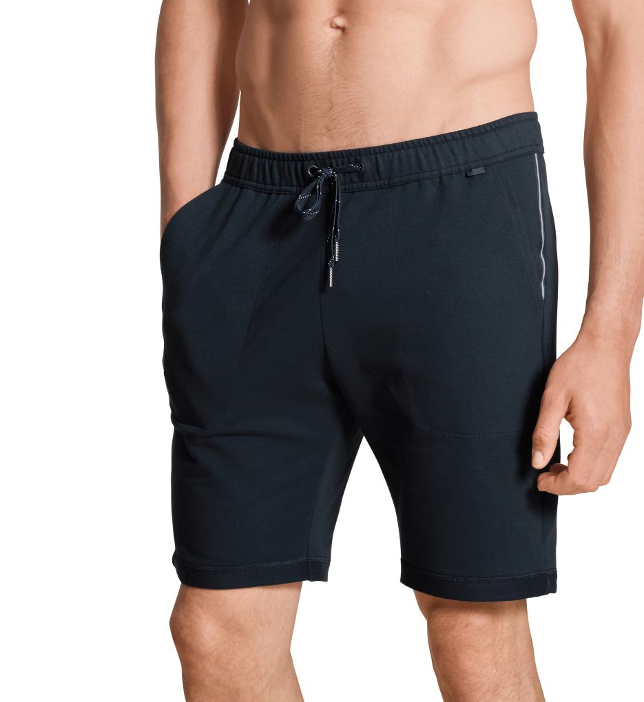 Comfy lounge shorts are styled with soft stretch knit French terry interior and turn-up at leg hems. Keep your phone and other items by your side with side slash pockets. Made of mercerized cotton and elastane. Covered elastic waistband stays securely in place. Woven drawstring runs through silvertone metal grommets at center waist. Slash pockets are deep enough to hold your phone and other small items. Striped band is sewn down at top sides. Logo tag is sewn at bottom front of waist. French terry interior adds a touch of comfort. Back of right leg has a functional patch pocket. Cotton knit is soft and allows the shorts to breathe. Multi-directional stretch provides a flexible fit. Two-ply, turned up cuffs have French terry surface. Back of inner waist has interior fabric/care info tag. Lightweight knit is great to wear in warmer temperatures. Perfect for sleep and lounge. Relaxed fit. Flyless. Calida Men's Remix Basic Cotton Stretch Lounge Short in Blue (27181) | Size XL | HisRoom.com